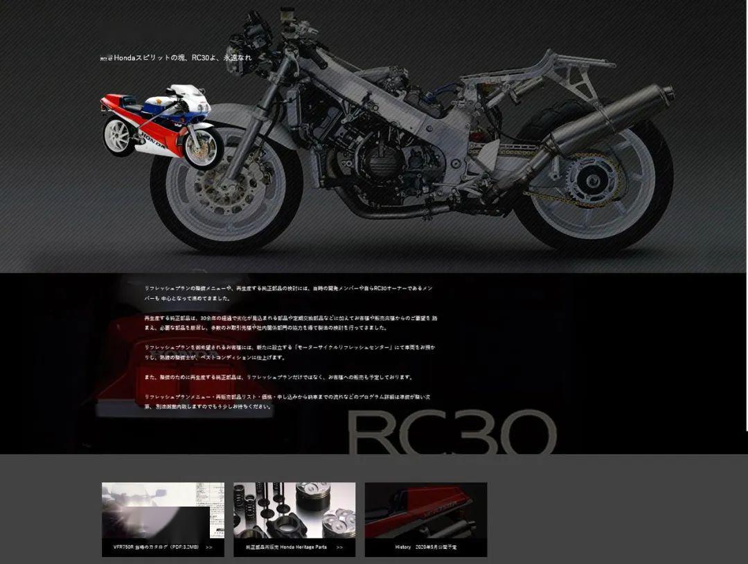 同時發(fā)布的信息,還包括廠方將在今年六月份開始,重新生產(chǎn)適用于 1987' VFR750R(工廠編號:RC30)的部分零件,預計到五月下旬發(fā)布諸如零件清單、價格等的具體細節(jié)。重新生產(chǎn)的零件,將以原廠正品(純正部品)的方式進行銷售。