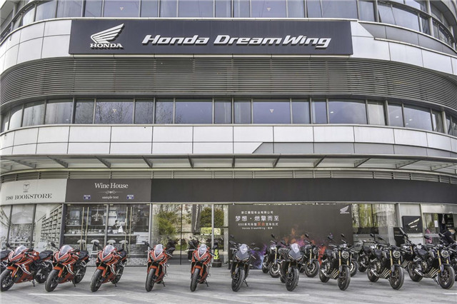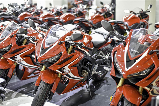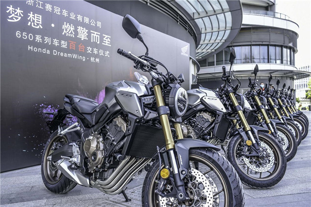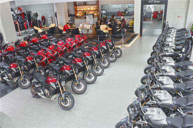 去年年末在Honda國內(nèi)公布上市的新一代中量級跑車CBR650R和復(fù)古街車CB650R可以說是很多車友都期盼已久的車型了,甚至在新車發(fā)布之前就已引發(fā)了大家的訂購熱潮,訂單從年初排到年中,除了去年年底國內(nèi)有少數(shù)幸運(yùn)兒提到現(xiàn)車外,大部分訂購的車友還在翹首以盼。但是今天在這家位于杭州濱江世茂智慧之門的Honda DreamWing杭州6s店內(nèi),我們卻看到了整整百臺!