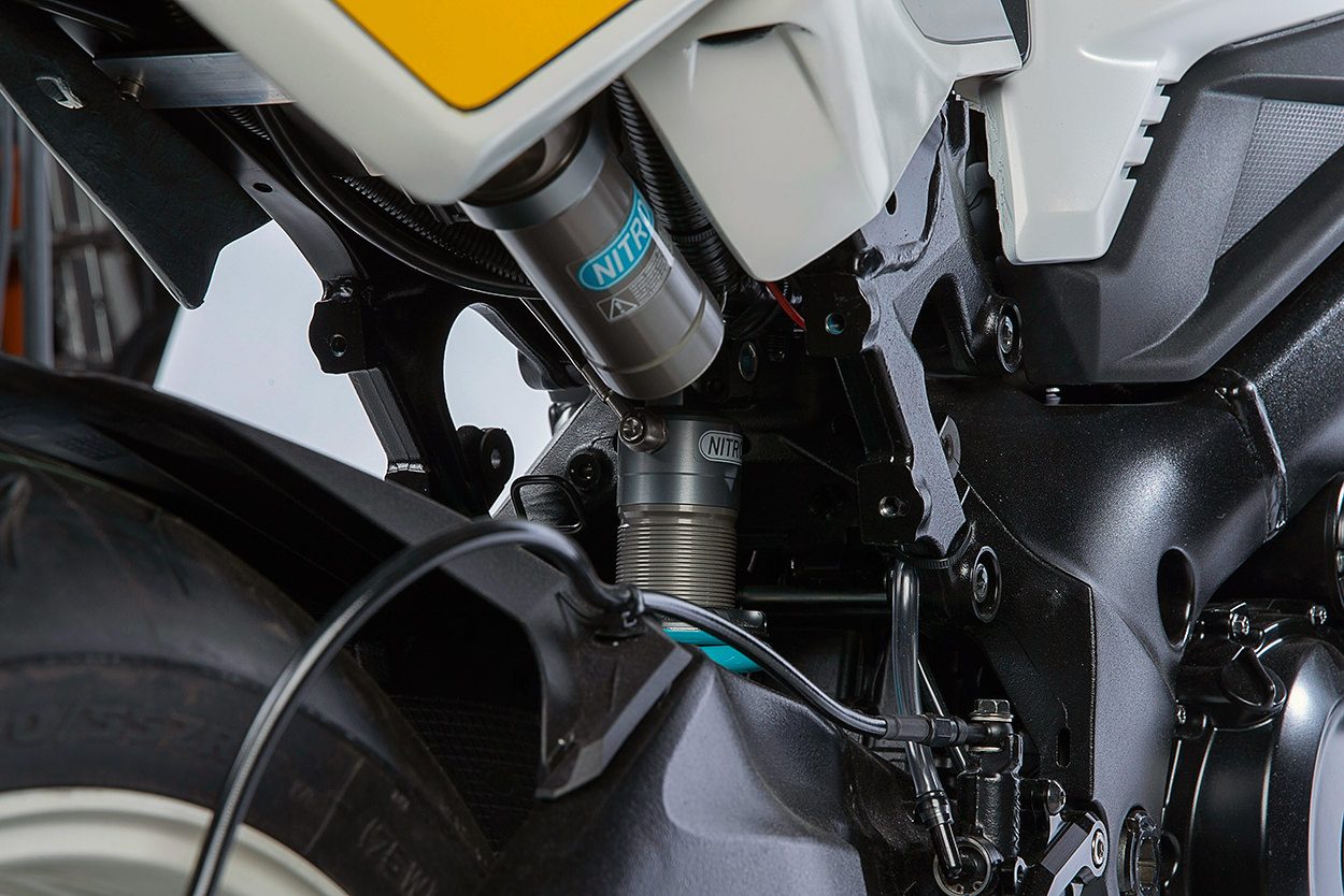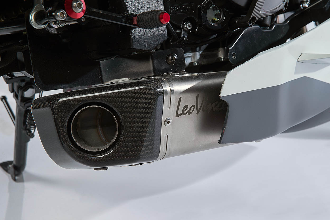 LeoVince品牌的排氣系統(tǒng)被認(rèn)為更加復(fù)雜,該排氣已被切割并以雅馬哈MT-07的樣式,嫁接到發(fā)動(dòng)機(jī)壁的下部。