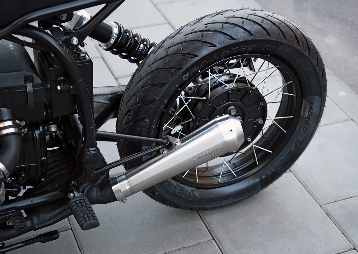 這臺(tái)寶馬R100R經(jīng)過了發(fā)動(dòng)機(jī)和碳纖維檢修,為了獲得最大的可靠性,它仍然使用其原始的排氣前段,氣體通過噴頭排出的廢氣排出,然后噴砂處理成黑色,最后用Spark的GP型消音器封蓋。