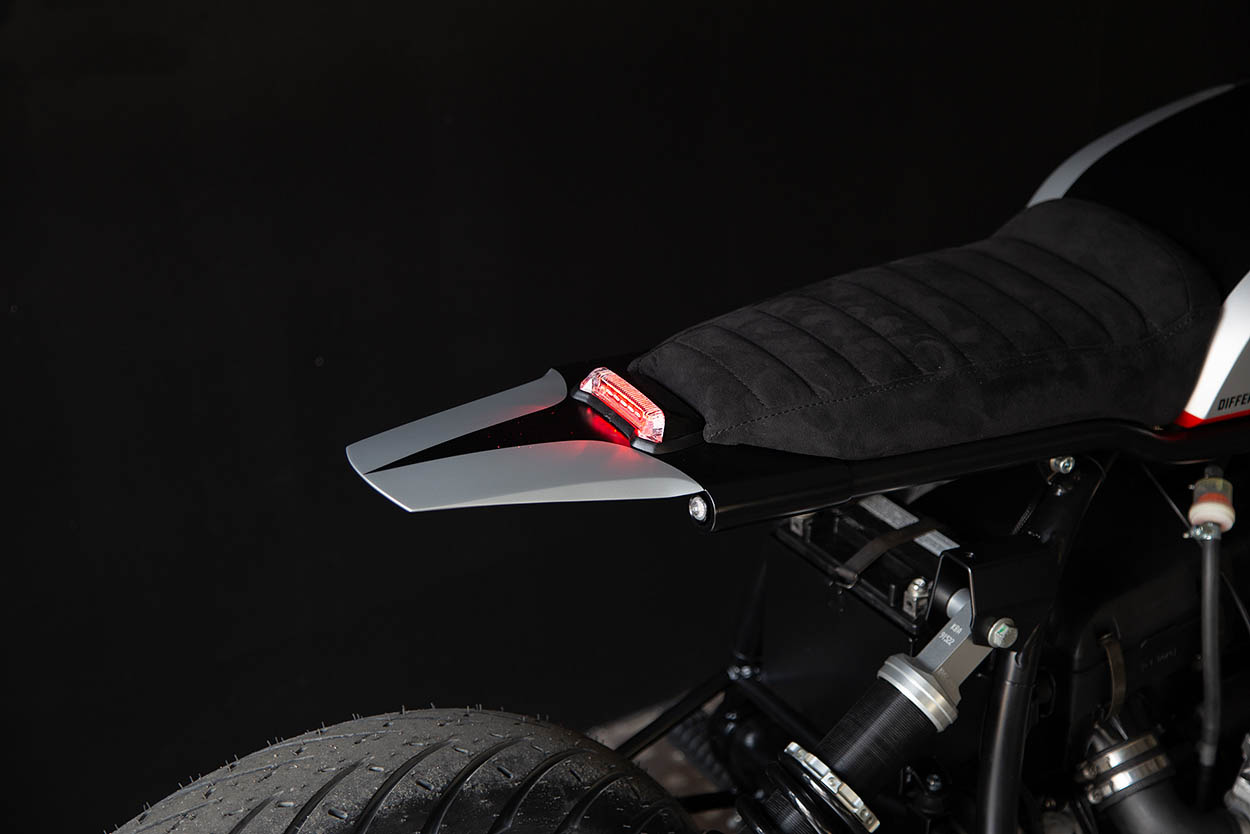 新的設(shè)計(jì)使整輛摩托車在視覺上向前傾斜,甚至還包括向座椅的微妙提升。一個(gè)手形的鋁制燃油箱和一個(gè)葉片狀的后擋泥板,這里有很多很棒的細(xì)節(jié),油箱帶有一套品牌的寶馬輪轂和蒙扎(Monza)風(fēng)格的油箱蓋,而定制座椅則被郁郁蔥蔥的阿爾坎塔拉(Alcantara)覆蓋。后部LED嵌入后部框架導(dǎo)軌中,頂部有一個(gè)細(xì)長的LED尾燈。