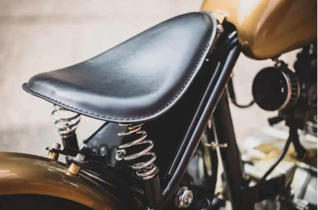 非常具有老味的硬尾車架就是由Cowboy’s Chopper以手工制作,而且由于管徑特別挑選了較細(xì)的7/8寸,因此也進(jìn)一步凸顯出車架后半的迷人線條。前后輪都是使用鋸齒紋路的復(fù)刻胎,并以前4.00-19來(lái)搭配后4.50-18,后土除在硬尾車架的優(yōu)勢(shì)下得以緊貼后輪,座墊則是配上典型的馬鞍座,底下的兩個(gè)彈簧也提供了一定的吸震效果。