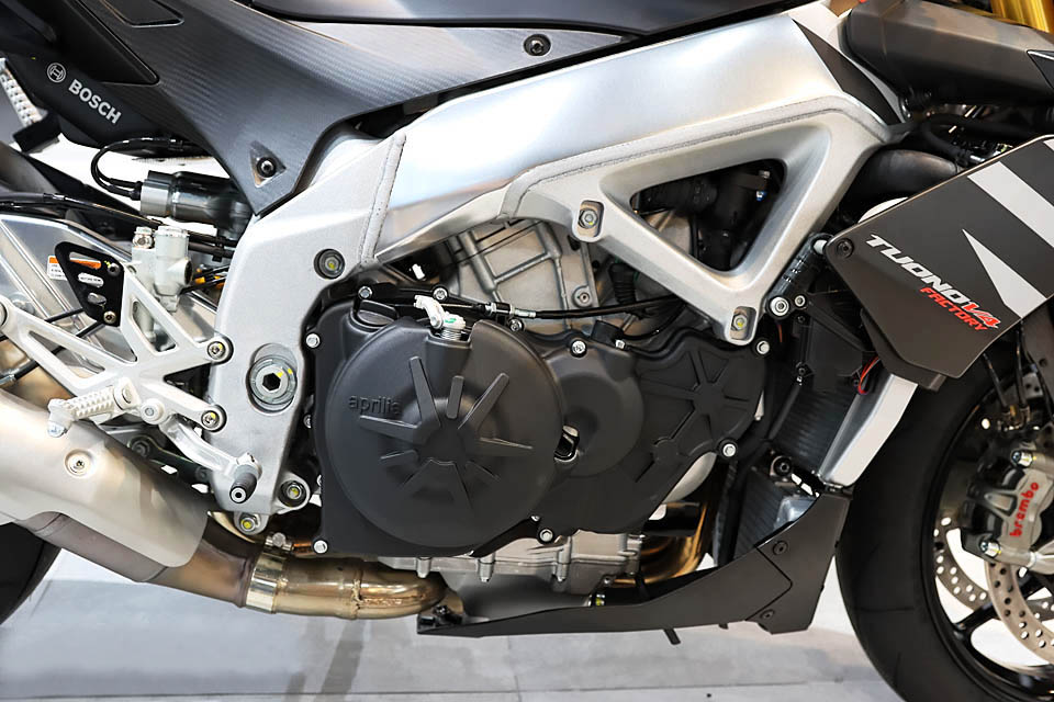 鋁合金雙翼梁式車架顯得格外明顯,而且不同于RSV4的大包圍,Tuono V4 1100 Factory的發(fā)動(dòng)機(jī)完全暴露在外。這臺(tái)水冷V型四缸16氣門發(fā)動(dòng)機(jī),擁有1077cc的排量,能夠爆發(fā)出175hp的驚人馬力,12.34kg-m的巨大扭矩,雖然未能達(dá)到目前頂尖街車的200hp馬力門檻,但是僅有185kg干重的Tuono V4 1100 Factory,也擁有接近1:1的馬力重量比。