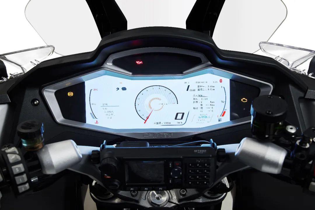 其他能夠觀察到的配置還有引人矚目的12.3英寸超大面積TFT彩色全液晶儀表,不僅車輛信息顯示一覽無余,同時(shí)提供多達(dá)4種駕駛模式切換,實(shí)現(xiàn)了手機(jī)投屏、來電顯示、地圖導(dǎo)航等等功能。另外硬件配置還可以看到采用了WP減震以及BREMBO卡鉗以及惡魔2高性能輪胎。此外工信部公告上標(biāo)注的297kg整備質(zhì)量或許也是許多人關(guān)注的重點(diǎn),這個(gè)大家伙的確算得上重磅,不過相似動(dòng)力平臺(tái)的KTM 1290 ADV整備質(zhì)量也要240kg左右,CF1250J更龐大的身軀重一點(diǎn)也是可以理解。作為一款巡航用途的公路旅行車,車重與相似定位的寶馬R1250 RT相仿,但這種車型往往賬面車重都非常嚇人,但它們動(dòng)起來之后的騎行感受卻都非常輕盈,所以這類車型更應(yīng)該關(guān)注的是操控的表現(xiàn),當(dāng)然了,這類車型對(duì)部分騎手來說在原地挪車、小半徑掉頭等許多使用場(chǎng)景下一定會(huì)有很大壓力,上手門檻較高。