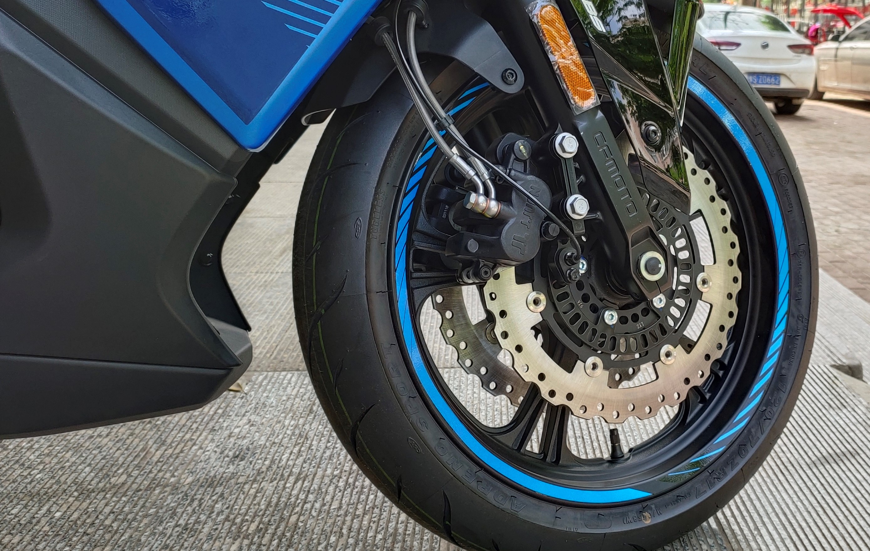 后剎車的單向單活塞卡鉗同樣由西互制動提供,也配有德國大陸ABS防抱死系統(tǒng),車輪樣式也都與街車400NK一致,400GT貼有藍(lán)色的輪轂貼紙。另外GT車型全新設(shè)計的粗壯排氣,與NK車型形成鮮明對比。