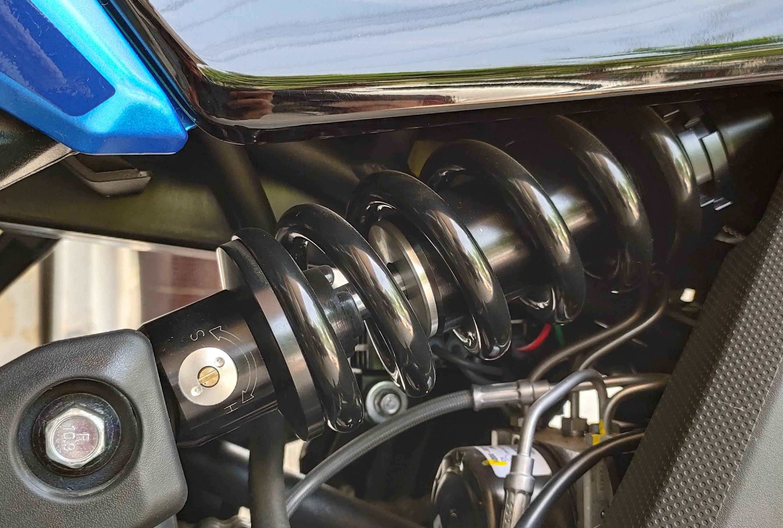 前后避震與400NK保持一致,春風(fēng)400GT配備傳統(tǒng)正立式前叉,以及油氣混合帶有預(yù)載調(diào)節(jié)的后減震,雖然正立式前叉看起來差那么點意思,但是從根本上避免了漏油的風(fēng)險。