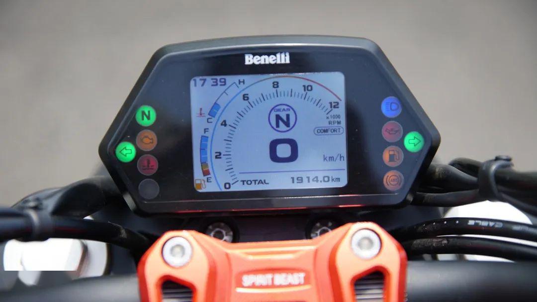這手把太寬了!中高速轉(zhuǎn)向輕松,但中低速回轉(zhuǎn)真有點(diǎn)外側(cè)手不夠用,估計(jì)身高馬大的摩友更舒適一些。儀表為全彩液晶形式,行車(chē)資訊顯示豐富,包含檔位、時(shí)間、轉(zhuǎn)速、時(shí)速、油量、水溫等都可清晰展示。