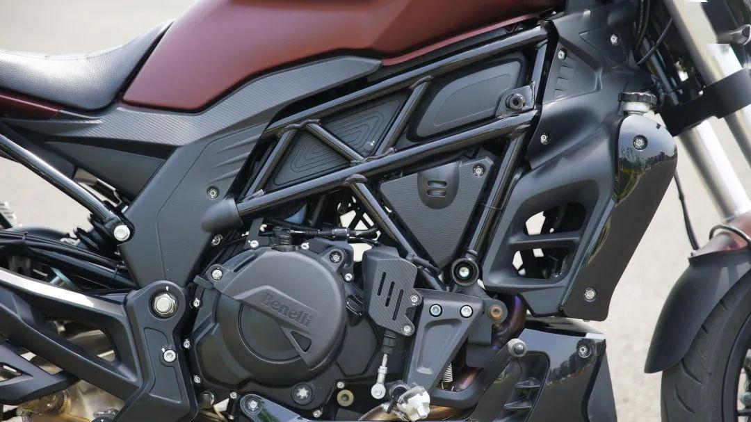 貝納利502C的主副車(chē)架、后搖臂均使用粗壯的管式車(chē)架,從成本控制和街道使用效果都可以滿足需求。