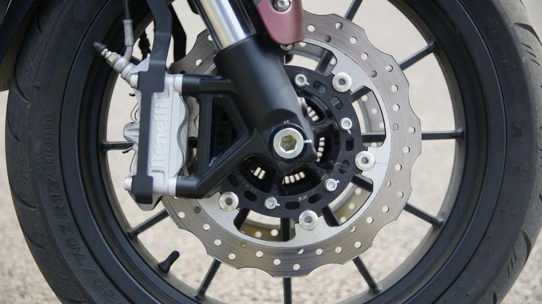 貝納利502C的前后輪組皆為街道運(yùn)動(dòng)17寸合金輪轂類(lèi)別,前輪組120/70-R17 、后輪組為160/60-R17,輪胎寬度對(duì)應(yīng)整車(chē)的動(dòng)力和設(shè)計(jì)很好,原配的天使輪胎并非運(yùn)動(dòng)類(lèi)型,本次測(cè)試車(chē)換了正新CM-S1輪胎。