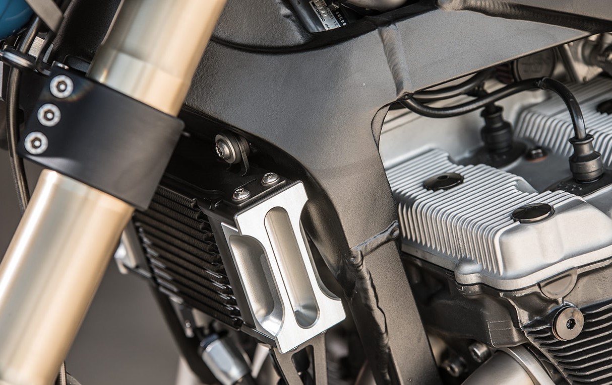 定制的分體式手把和上聯(lián)板,其中裝有LSL的碳纖維棒,還有Acewell speedo和售后市場(chǎng)Harley V-Rod大燈。一切都安裝在手工制作的支架上,并且它們也都集成在一起。大燈支架用螺栓固定在速度表支架上,該支架也固定著制動(dòng)液箱。還有一個(gè)新的機(jī)油冷卻器,裝飾有精美的側(cè)擋板,Goodridge生產(chǎn)的管線和漂亮的小管線隔板。