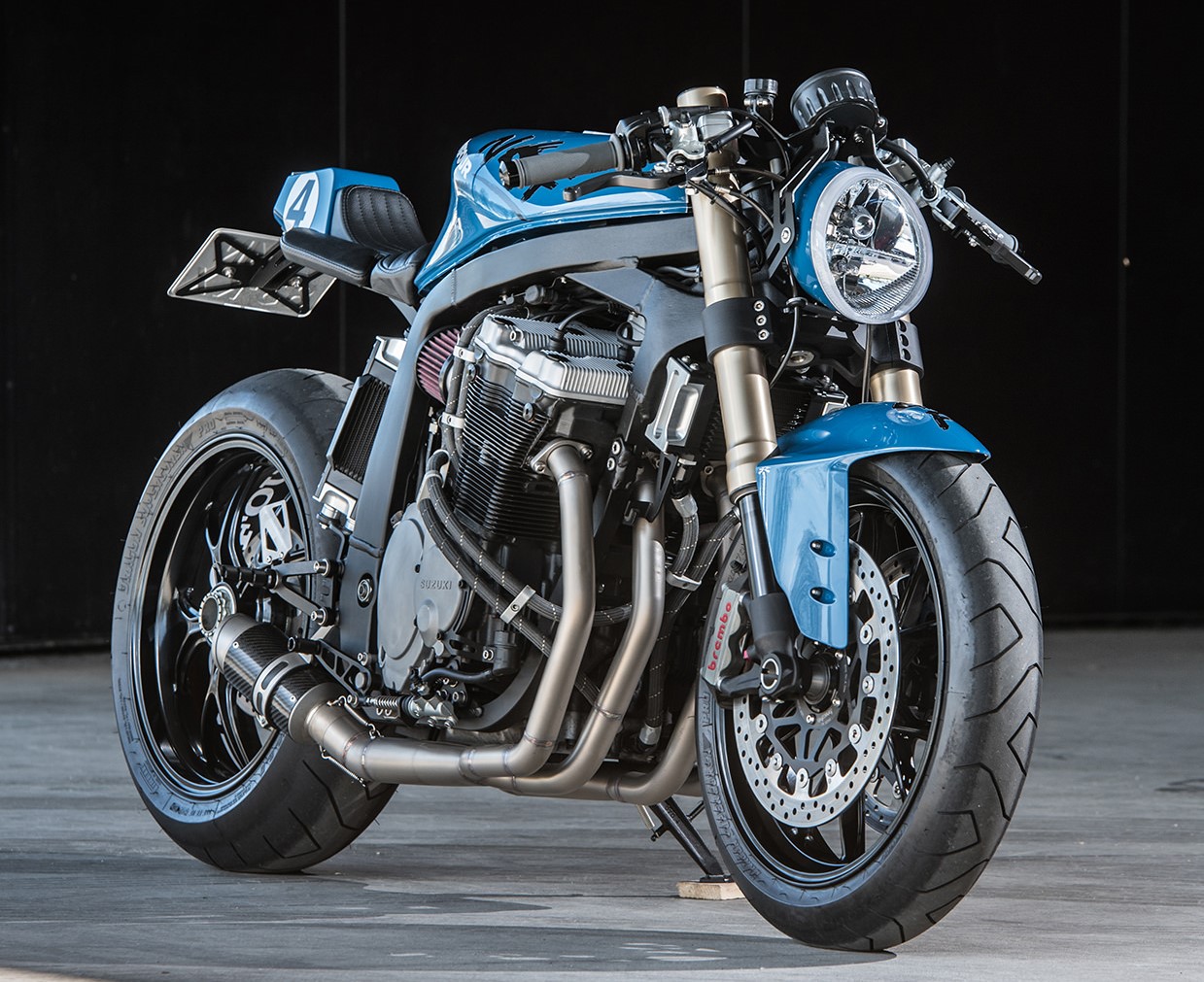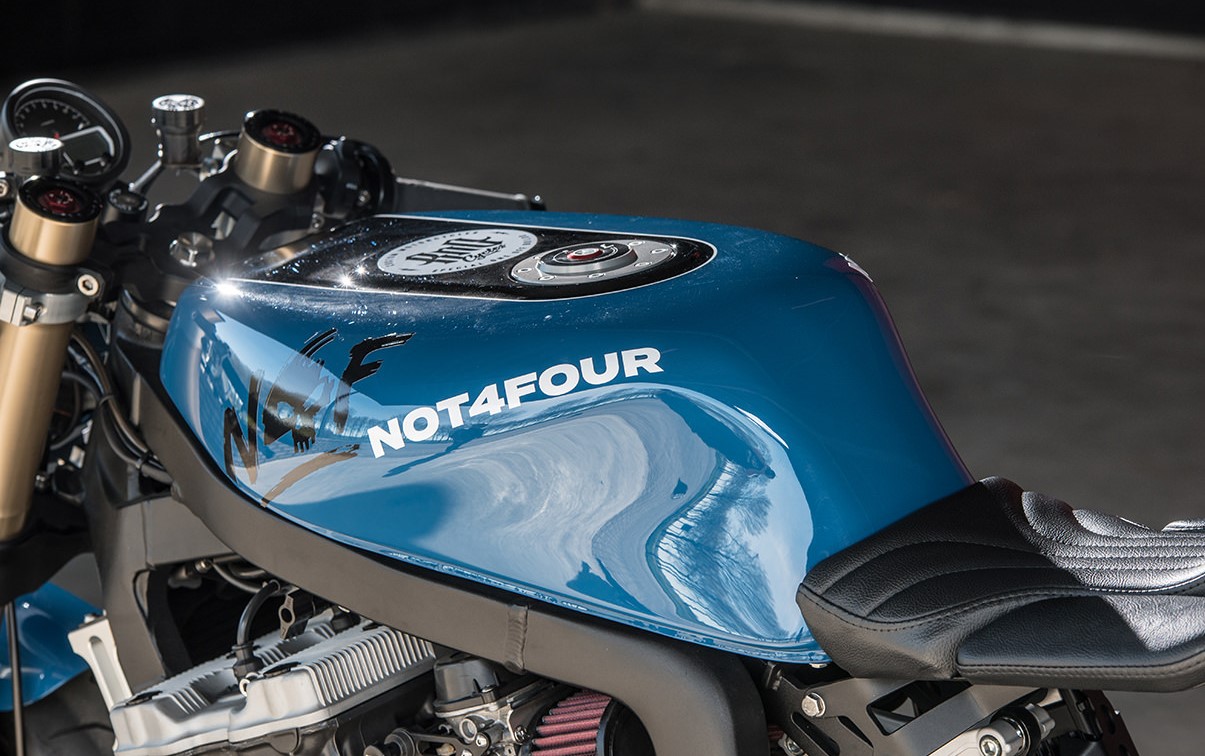 性能升級(jí)包括帶有K&N過濾器的40毫米Mikuni,以及定制的不銹鋼四合一排氣系統(tǒng),也有新的接線,并且鋰離子電池隱藏在尾峰下方。最后的改動(dòng)包括對(duì)燃油箱的細(xì)微調(diào)整,現(xiàn)在再加上改良的LSL氣蓋,并且涂裝上時(shí)髦的藍(lán)色油。