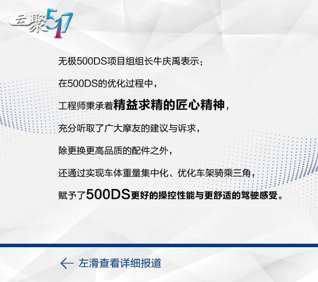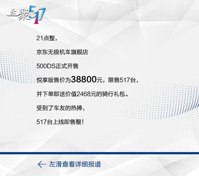 517我要騎,在這個(gè)全國摩友日無極首批500DS下生產(chǎn)線 ,并在網(wǎng)上正式開始預(yù)定,517臺(tái)幾秒鐘就被搶購 一空。
