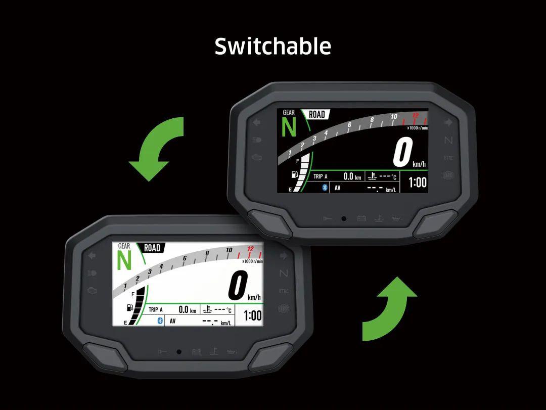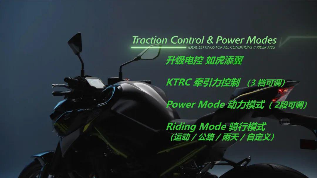接下來便是重頭戲,2020款 Kawasaki Z900 新增的電控系統, 【KTRC 牽引力控制系統】三擋可調;【 Power Mode 動力模式】兩段可調;最后還有 【Riding Mode 騎行模式】運動/公路/雨天/自定義四種騎行模式。