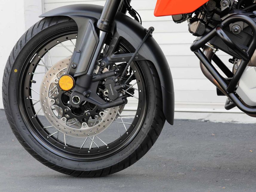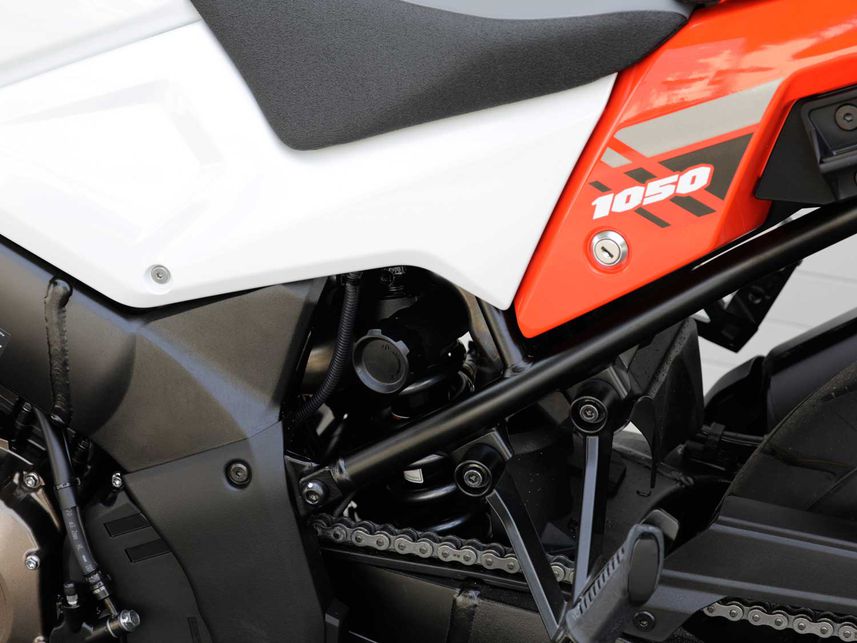 V-Strom 1050XT的懸架行程剛剛超過150mm,方便的預(yù)緊調(diào)整旋鈕,使你可以根據(jù)操作偏好輕松修改預(yù)緊力。在崎嶇的路面上輕松的行駛,轉(zhuǎn)彎時也能保持繃緊。但是與同類其他摩托車相比,車輪尺寸(前19英寸,后17英寸)和缺乏發(fā)動機保護功能,降低了V-Strom的越野性能。