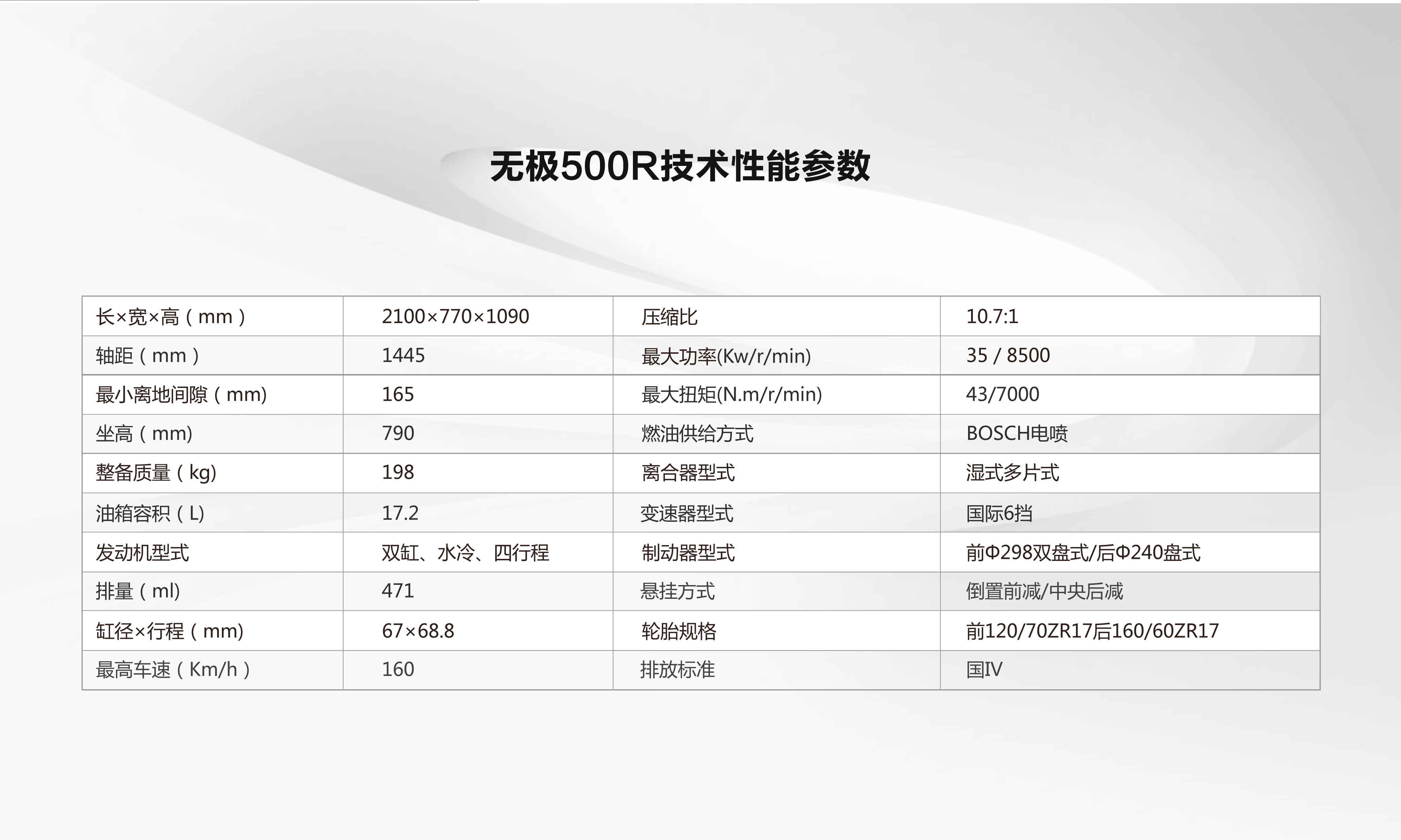 提起無(wú)極就不得不說(shuō)它的500cc系列車型,其中街車500R是其500cc首款車型,也正是這臺(tái)車打響了無(wú)極的名號(hào),也讓KE500這臺(tái)發(fā)動(dòng)機(jī)成為國(guó)內(nèi)炙手可熱的大排量雙缸動(dòng)力平臺(tái),而無(wú)極500R本身也代表著無(wú)極在街車造詣上的標(biāo)桿車型。