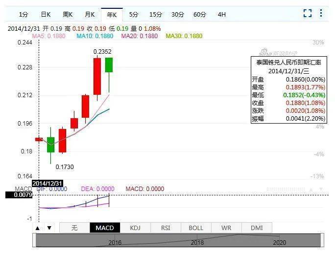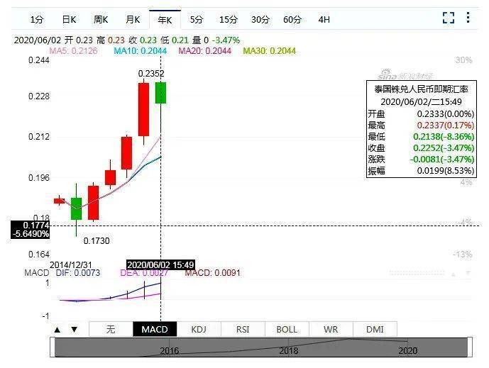 而造成這種現(xiàn)象的最根本原因,是泰銖匯率上的變化:2014 年十二月的時候,1 泰銖可兌換 0.188 元人民幣(2014 年十二月 31 日收盤價,下圖 1/來源:新浪財經(jīng));而到了 2020 年六月,1 泰銖可兌換 0.2252 元人民幣(2020 年六月 2 日收盤價,下圖 2/來源:新浪財經(jīng))。也就是說,現(xiàn)在與 2015 年的時候相比,泰版車的進口成本、因為匯率的變化而出現(xiàn)的了近 20% 的上漲,原來 2 萬元成本的車、現(xiàn)在的成本變成了將近 2.4 萬元。從匯率的變化曲線看,過去幾年,泰銖兌人民幣的匯率、一直呈上升的態(tài)勢。