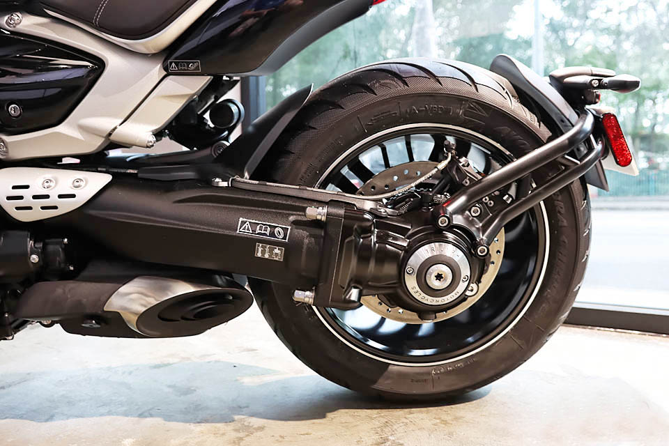 全新鋁制框架減重功不可沒,鑄鋁合金單搖臂和軸傳動相當?shù)挠懈呒壐校?40mm寬的Cobra Chrome后輪胎提供出色的抓地能力,看似笨拙的車身在彎道表現(xiàn)依然非常靈活,壓彎這種日常操作完全不在話下。