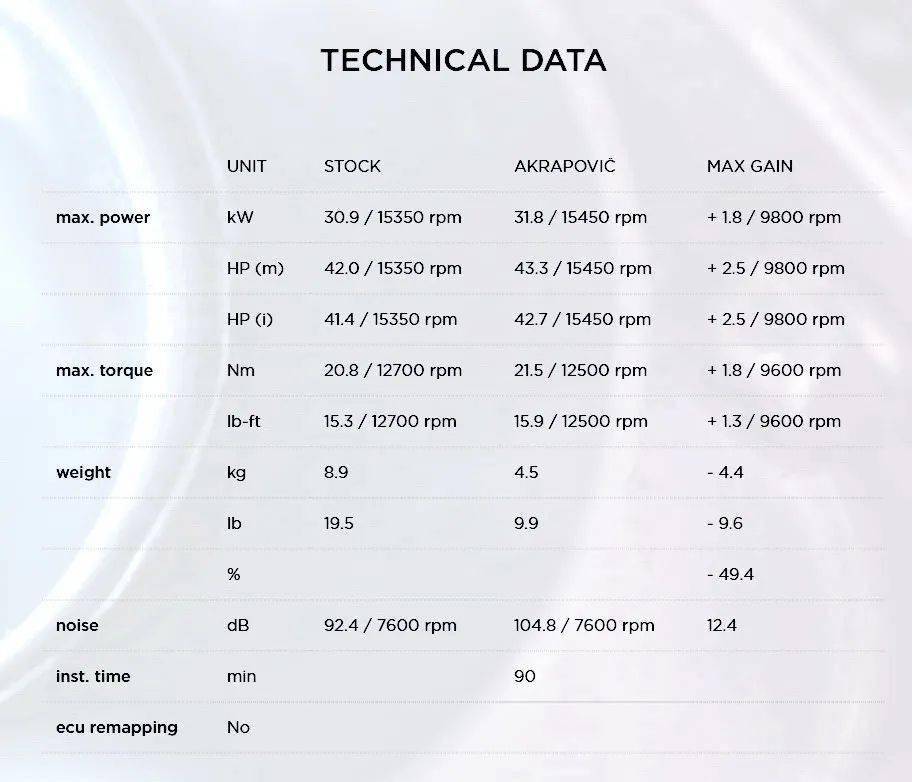 參考 “ 蝎子 ” 所做的測試,與原廠排汽系統(tǒng)相比,改裝的排汽系統(tǒng)、峰值動力輸出增加了 0.9 kw(標準狀態(tài) 30.9 kw/約 42 匹、改裝狀態(tài) 31.8 kw/ 約 43.3 匹),最大差異值在 9,800 rpm 的時候、 “ 蝎子 ” 改裝排汽系統(tǒng)獲得了比標準排汽管狀態(tài)多 1.8 kw 的輸出。此外,重量也大幅降低了 4.4 公斤。