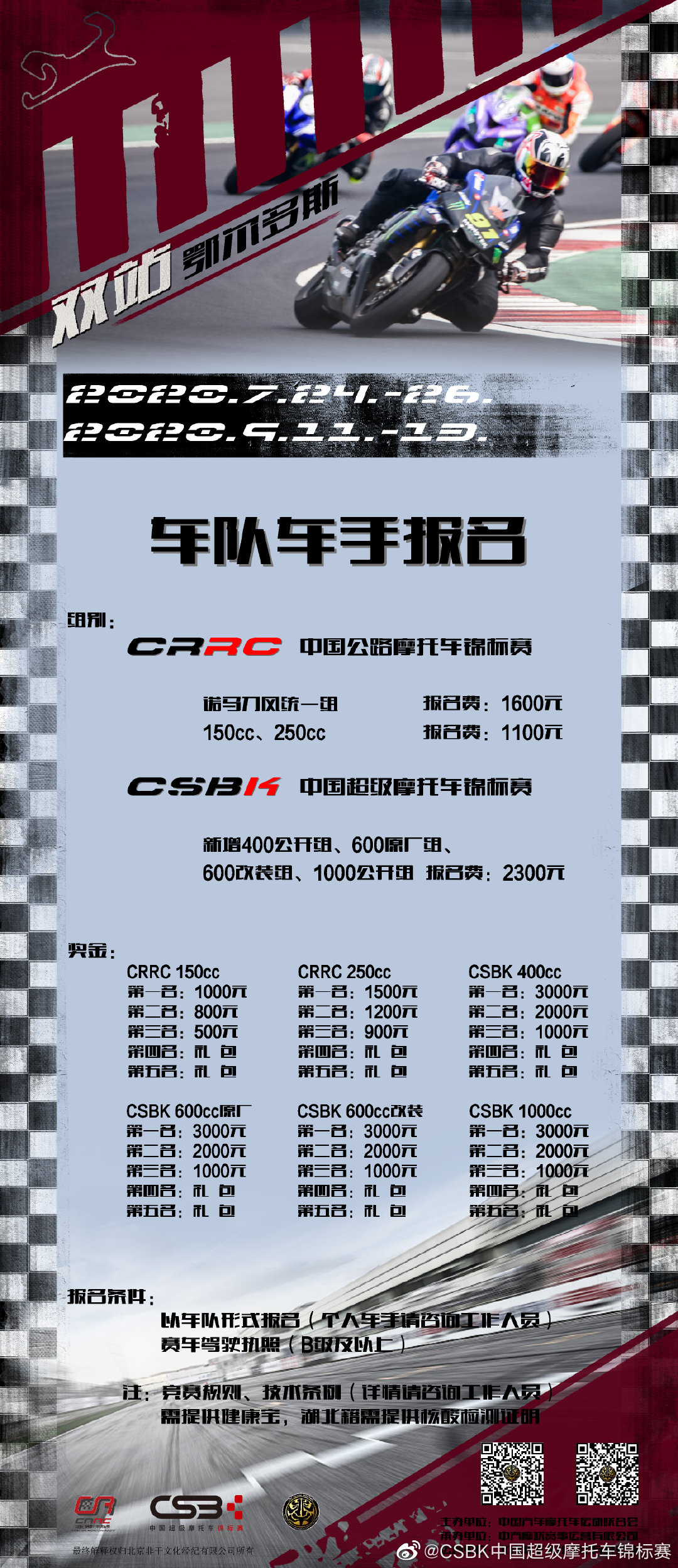 核心提示: 【2020賽歷 CSBK CRRC】大家期待已久的賽歷來了,掃描二維碼,即可報(bào)名參賽。2020鄂爾多斯等你來戰(zhàn)!