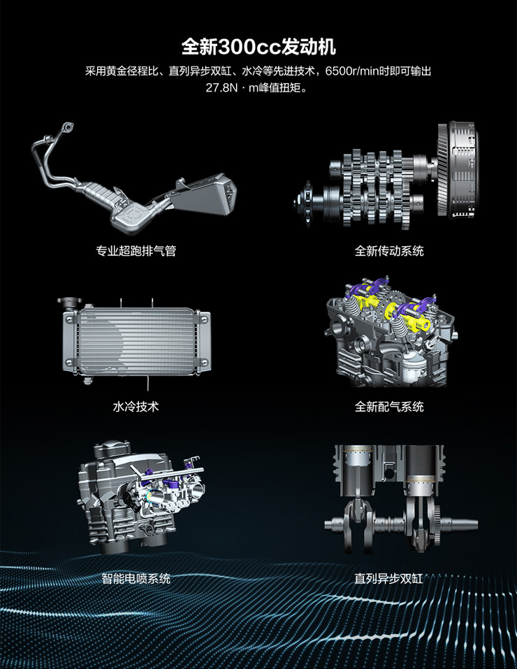 有人說(shuō)這臺(tái)發(fā)動(dòng)機(jī)是250的擴(kuò)缸機(jī),有人說(shuō)這臺(tái)發(fā)動(dòng)機(jī)是全新研發(fā)的,無(wú)論屬于哪一種這臺(tái)發(fā)動(dòng)機(jī)在低轉(zhuǎn)表現(xiàn)搶眼高轉(zhuǎn)表現(xiàn)平平。排量為298cc的異步雙缸發(fā)動(dòng)機(jī),最大功率21.5Kw,最大扭矩27.8Nm,0-100km/h加速時(shí)間7.8秒左右,這個(gè)水平和春風(fēng)250NK幾乎相當(dāng)。