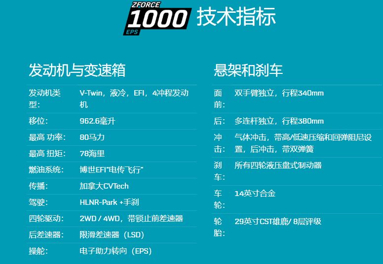 全新的ZFORC 1000 EPS在國(guó)外已經(jīng)上市,價(jià)格為17,990(約8.75萬(wàn)人民幣),提供12個(gè)月的保修期,只有一種紅色提供。