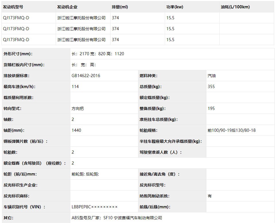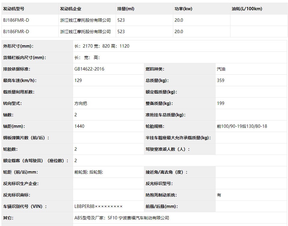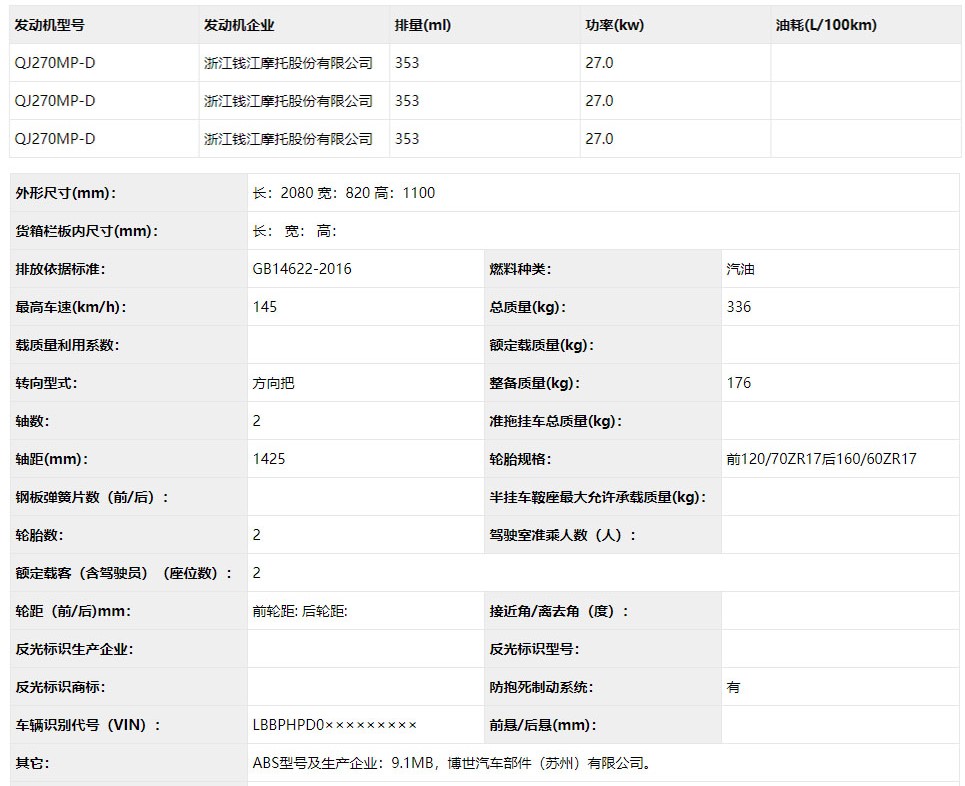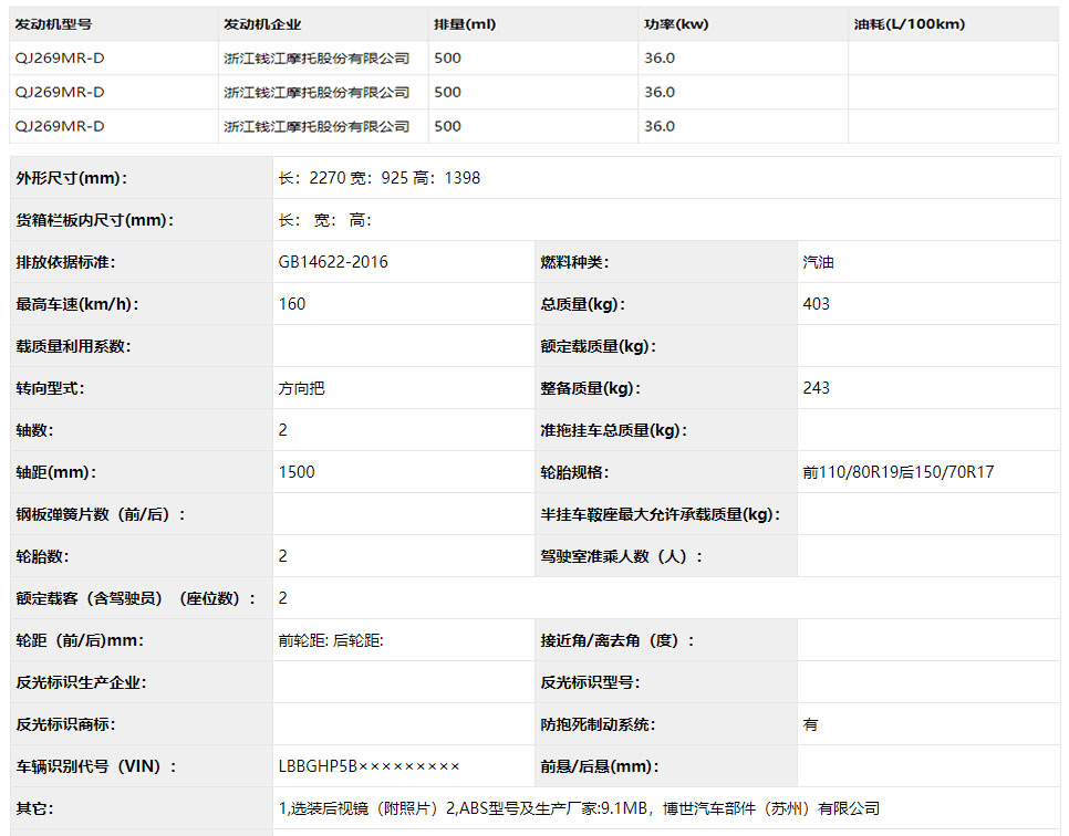 其他參數(shù)如下圖,500cc雙缸發(fā)動機是TRK502同款,最大功率36kw基本保持一致,另外錢江的車型定位更高端,所以ABS直接采用博世9.1的,而并非貝納利上常見的國產(chǎn)ABS。