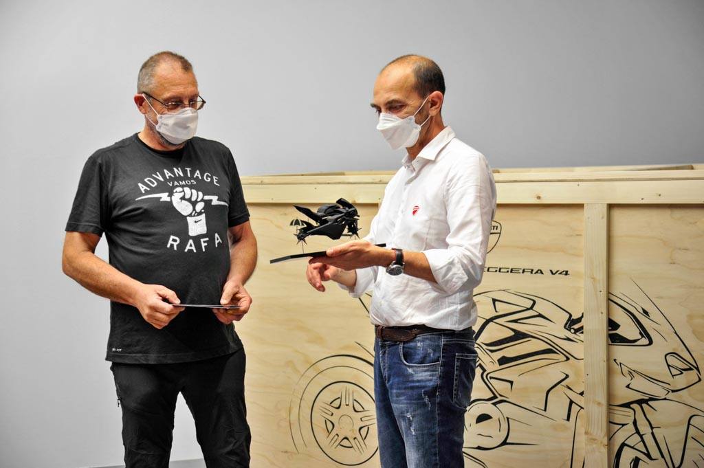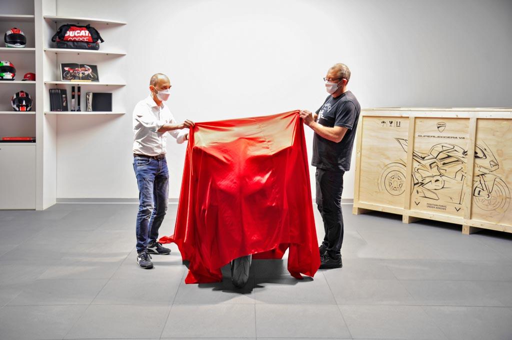 杜卡迪控股公司首席執(zhí)行官克勞迪奧·多梅尼卡里(Claudio Domenicali)公開了Superleggera V4編號001,然后將其移交給了Filip Van Schil。儀式在杜卡迪設(shè)計中心內(nèi)舉行。