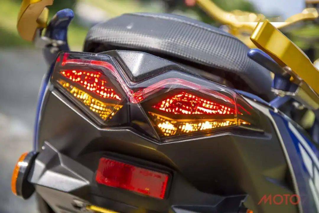 將車牌下移到改裝的燈匠后土除上,原本的牌架換上了金色套件,讓車尾的視覺效果更加豐富。除此之外,尾燈當(dāng)然是改裝不能放過的部分,KOSO海鷗整合式尾燈組讓車尾更顯動(dòng)感,其中海鷗般的光條設(shè)計(jì)更是獨(dú)具特色。