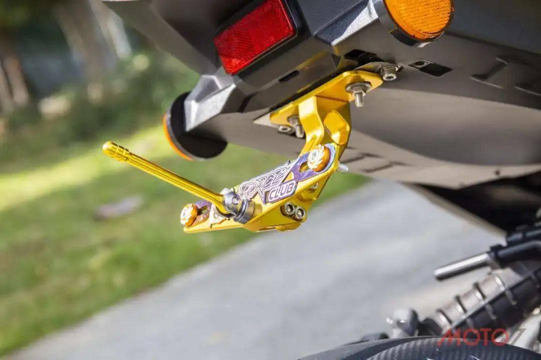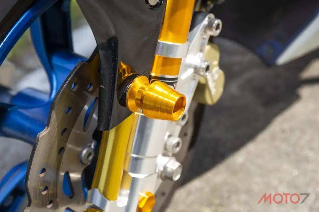 卡鉗的部分使用Brembo的卡鉗,前叉則是改裝了國(guó)產(chǎn)品牌DY的金色前叉