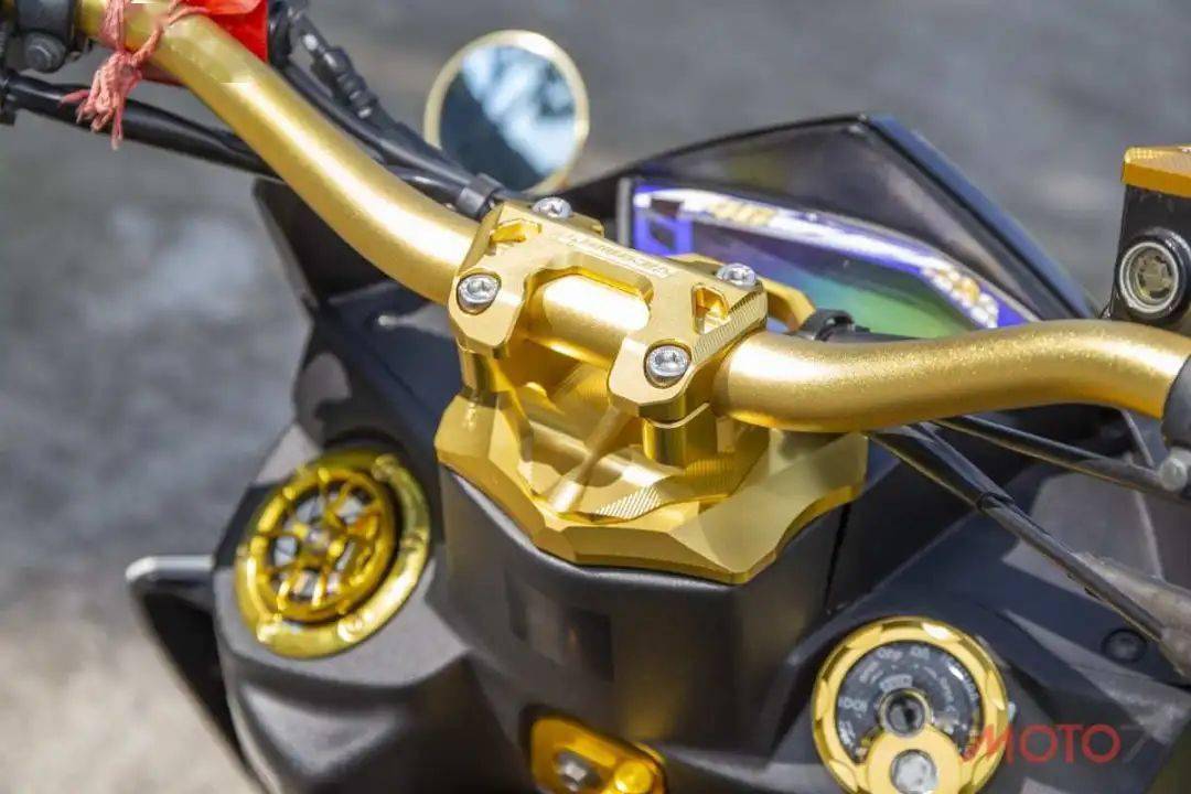 把手部分,換掉原廠的把手與冠座,采用金色的Go Works手把與把座,握把的部分則換上RIZOMA的握把套,搭配EPIC的可調(diào)式拉桿,當(dāng)然,整組都是金光閃閃的!
