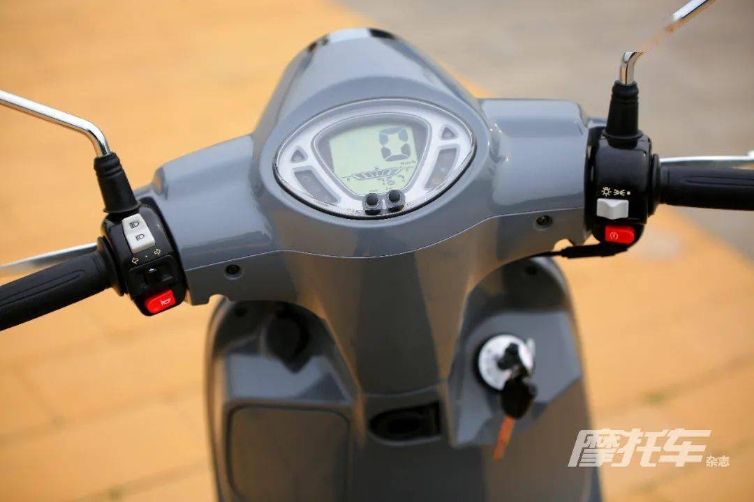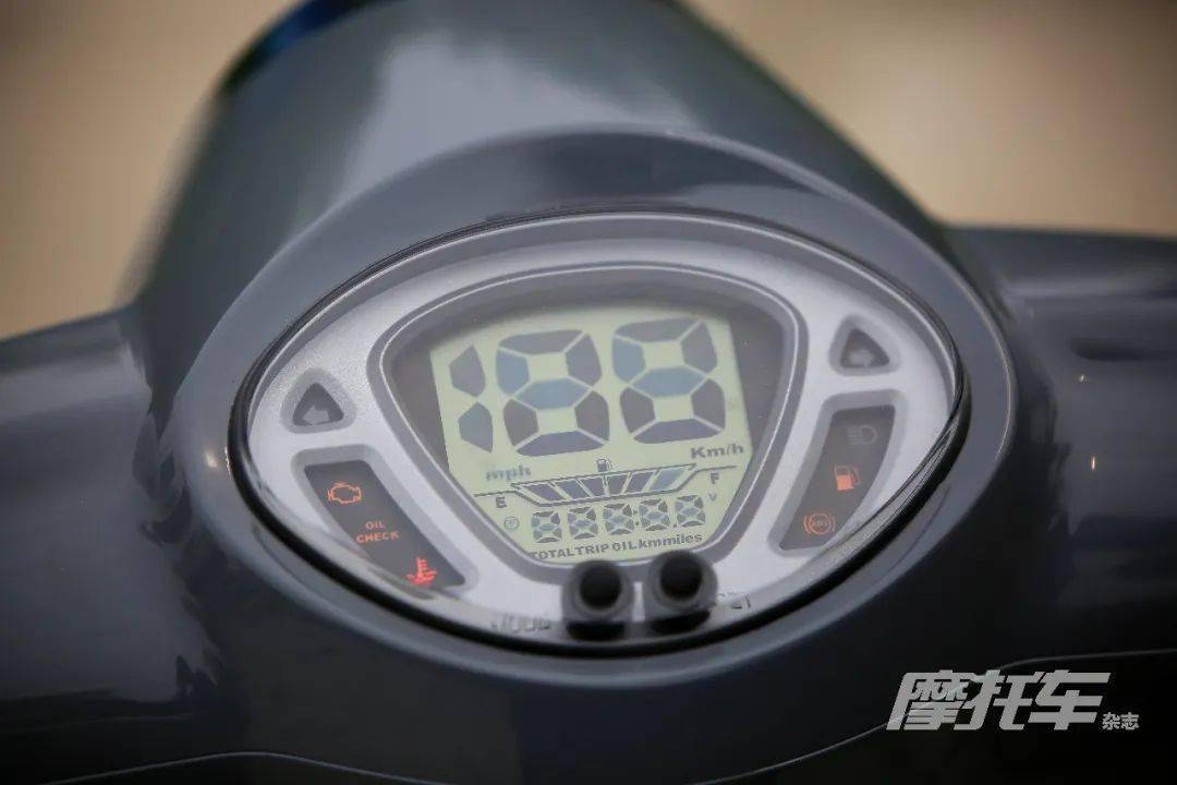 FIDDLE 125 ABS在儀表處也做了較大的改動,將老款指針式與小液晶屏組合的儀表換為正顯全液晶儀表。實(shí)用性上來說沒什么問題,基本的信息也都有,但從美觀度來說,這個(gè)儀表的做法其實(shí)是拉低了外觀分?jǐn)?shù)的。整個(gè)儀表蓋板呈橢圓形,中間的不規(guī)格扇形是液晶儀表的主要顯示區(qū)域,但液晶面板兩側(cè)露出了較大黑邊,上下邊角處又被儀表開孔做了遮罩處理,這樣的做法想的有些粗糙。而且儀表的時(shí)速顯示相比老款儀表,辨識度確實(shí)提升明顯,但過大的字號顯示,讓人總有一種在看計(jì)算器的錯(cuò)覺,算是一個(gè)小遺憾吧。