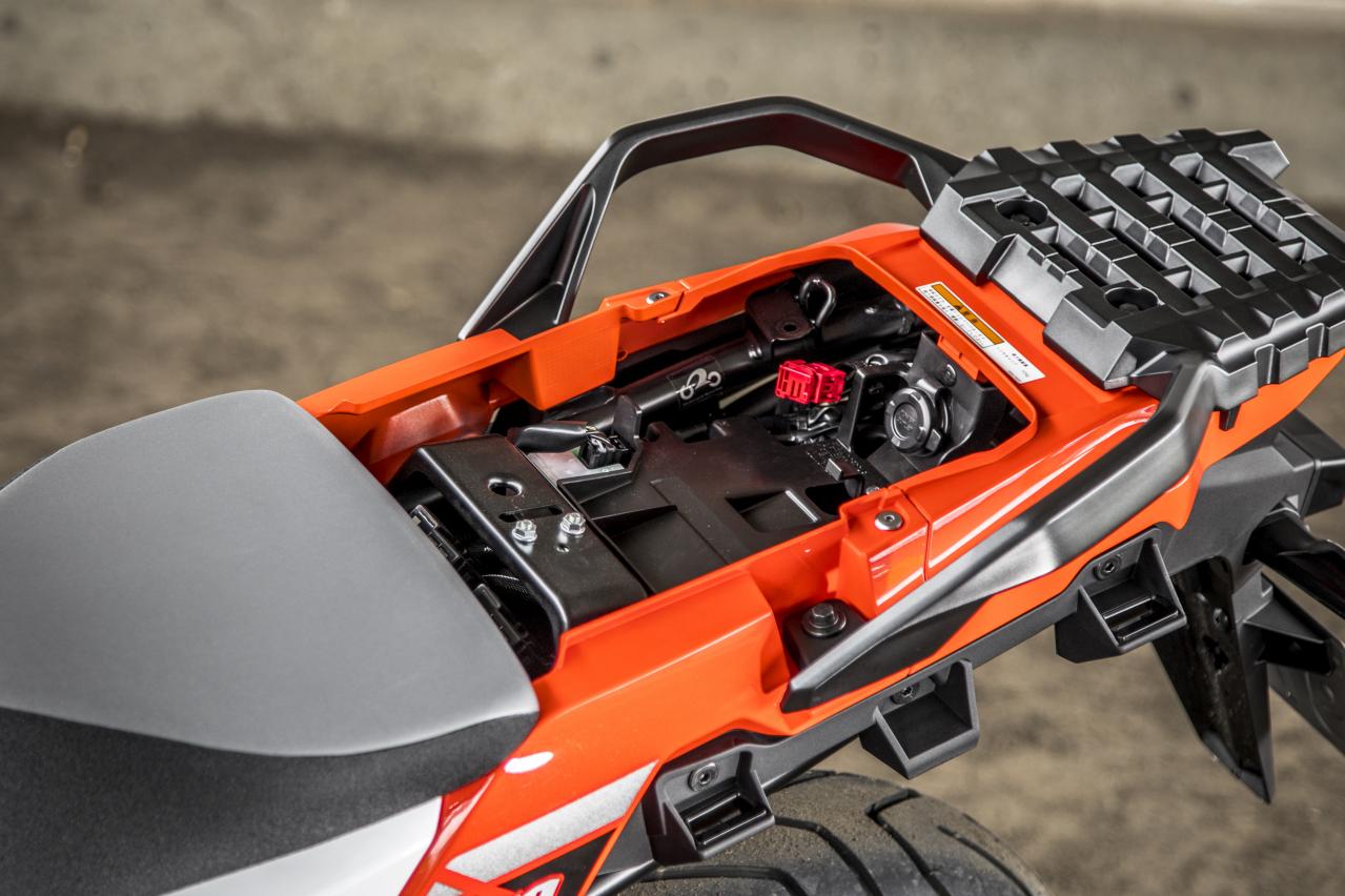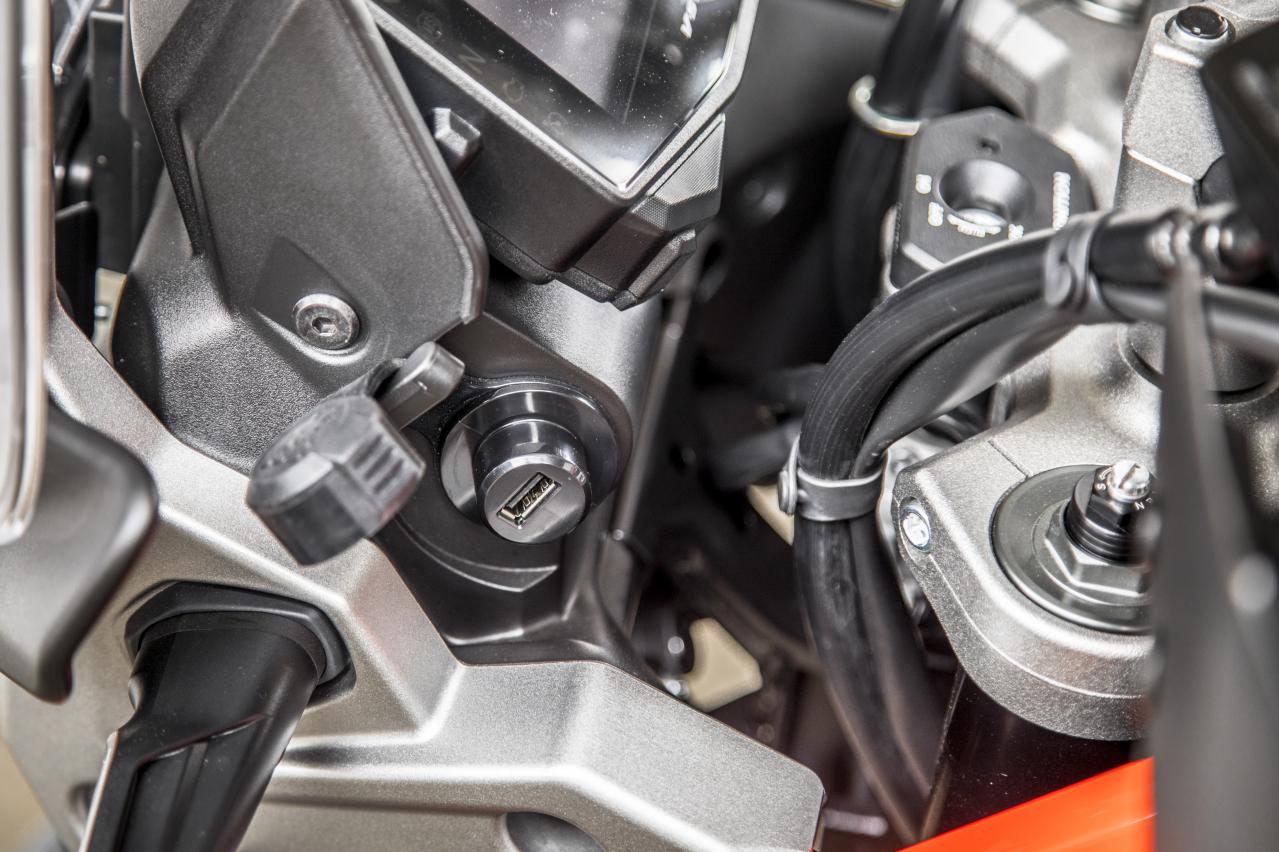 儀表旁配有USB電源,可用于為智能手機(jī)等電子設(shè)備充電,風(fēng)擋后面有一個橫桿,可幫助固定安裝相關(guān)的套件,比如運動相機(jī)或者獨立的GPS導(dǎo)航等等。