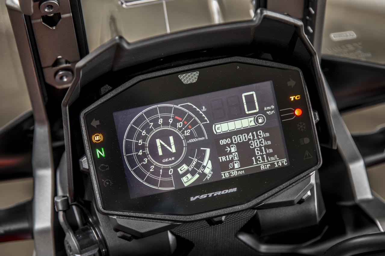 多功能的儀表板使用負(fù)顯液晶屏,Vstrom 1050采用白色背景,“XT版”采用黑色背景。并且始終顯示SDMS(鈴木行駛模式),TCS(牽引力控制系統(tǒng))和ABS的模式。