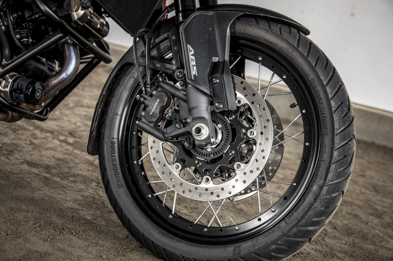 與具有10輻鋁合金鑄輪的V-STROM 1050相比,“ XT版”使用輻條輪,輪胎尺寸為前輪110 / 80R19,后輪150 / 70R17,配備普利司通(Bridgestone)制造的BATTLAX ADVENTURE A41輪胎。