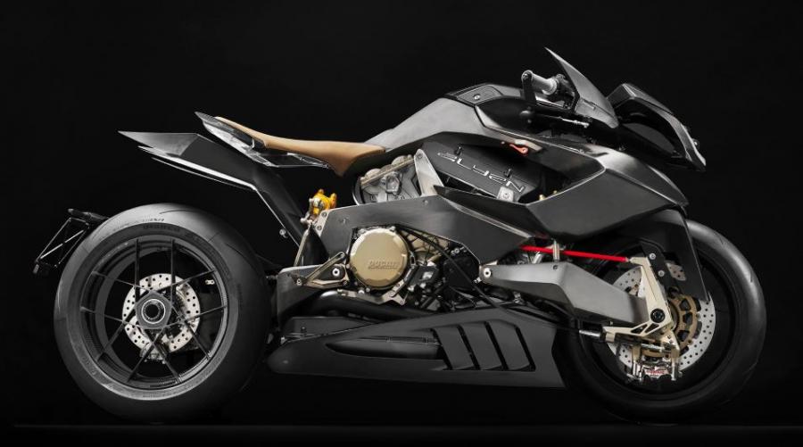 Vyrus Aylen與傳統(tǒng)摩托車比起來顯得非常異類,更像是外星來客版的外形讓人過目難忘。Vyrus Aylen由杜卡迪Panigale的V-twin發(fā)動(dòng)機(jī)提供動(dòng)力,最大馬力200bhp,采用輪轂式轉(zhuǎn)向系統(tǒng),車身大量采用碳纖維材質(zhì)包括碳纖維后輪轂,在不影響強(qiáng)度的前提下達(dá)到車重輕量化的效果。如此激進(jìn)超前的設(shè)計(jì),這個(gè)價(jià)格也算是符合其身份。