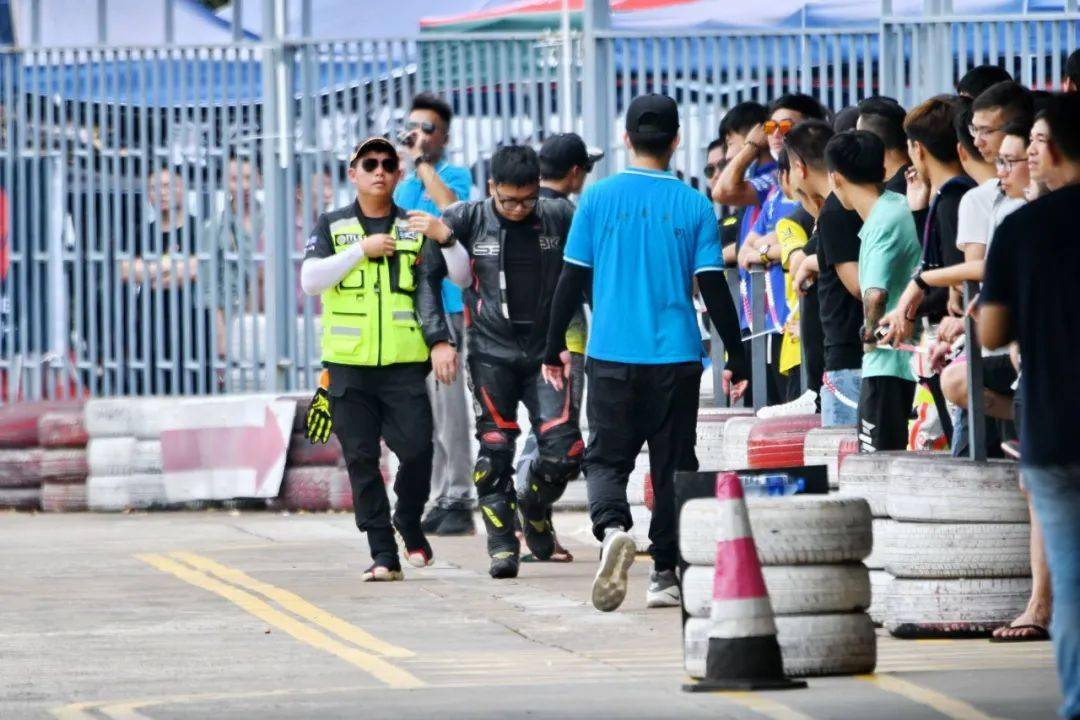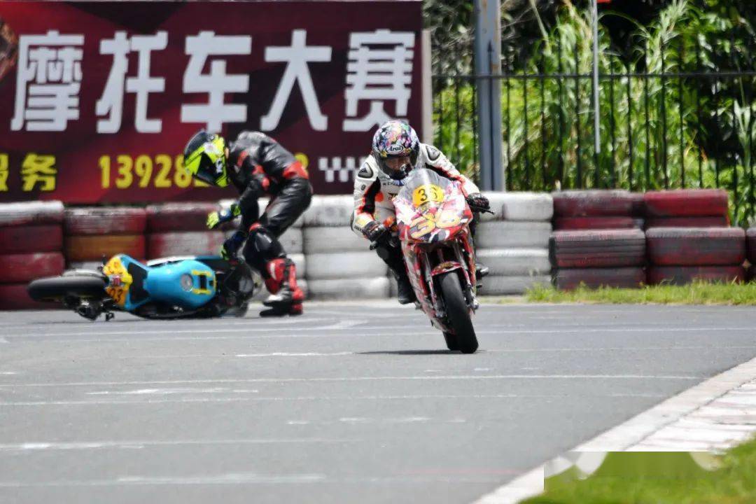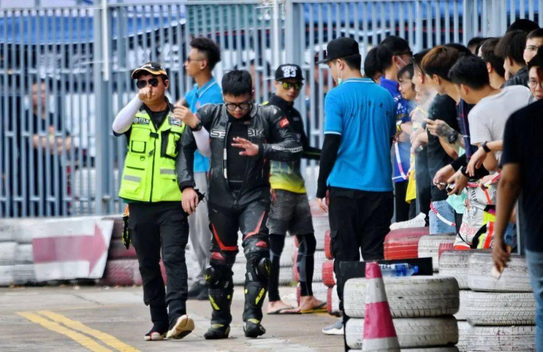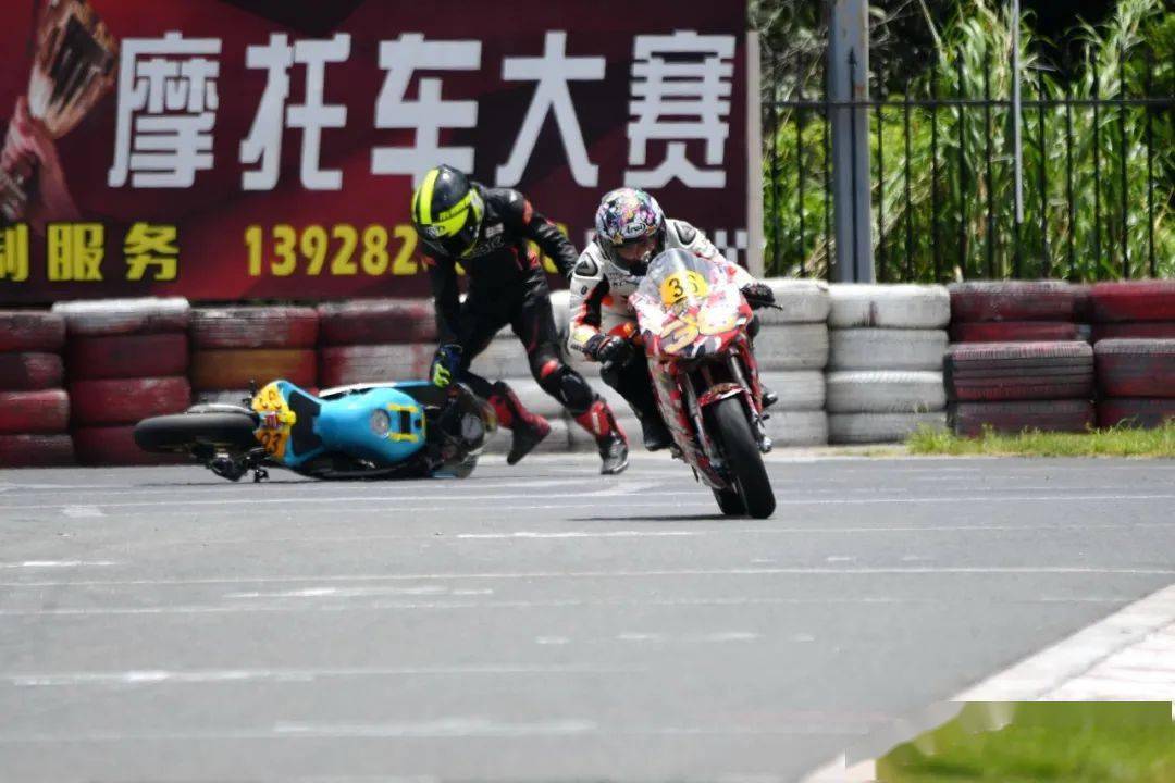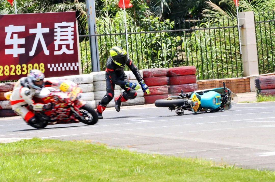 到了最后一圈、同樣的位置附近,駕駛 24 號(hào)車(chē)的賴俊明在與 28 號(hào)車(chē)黃艷智的近身較量中摔倒,同時(shí)也波及了黃艷智、因?yàn)楸茏尪鴽_出了跑道。而在此前的大部分比賽時(shí)間里,兩人一直就處于彼此貼身的追逐中。