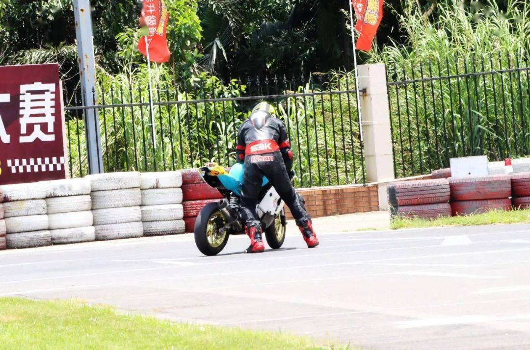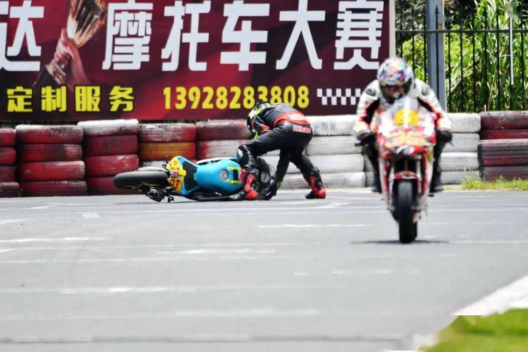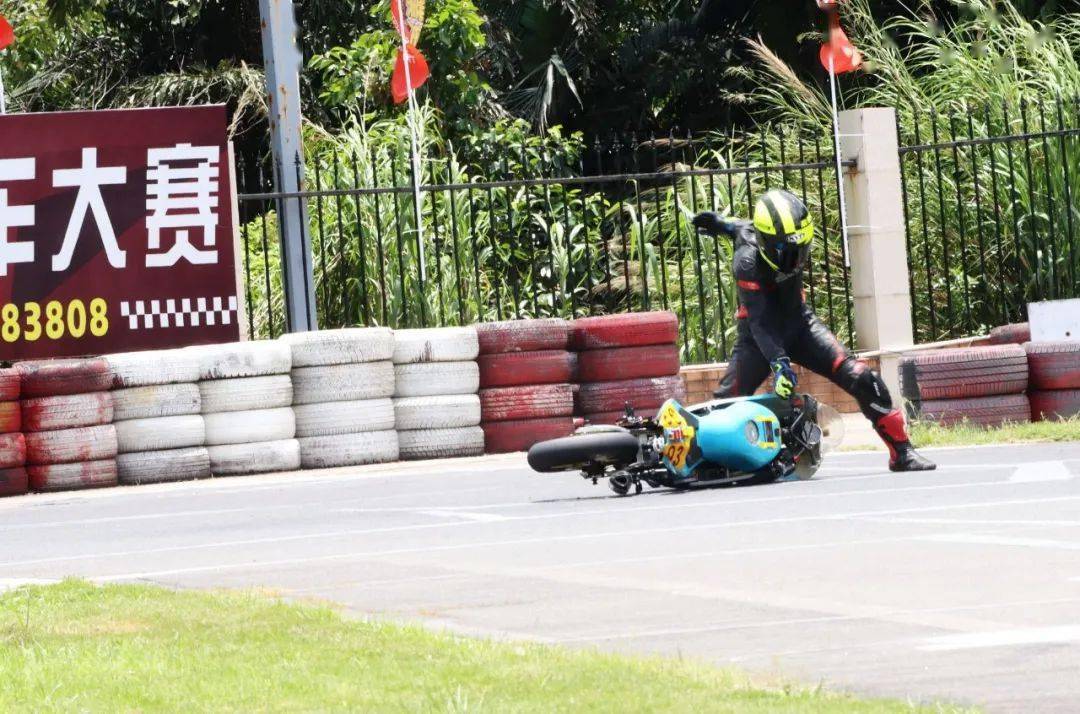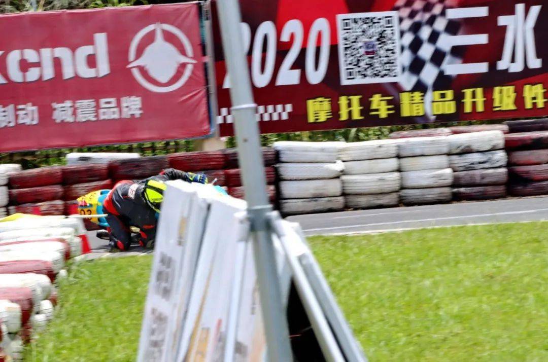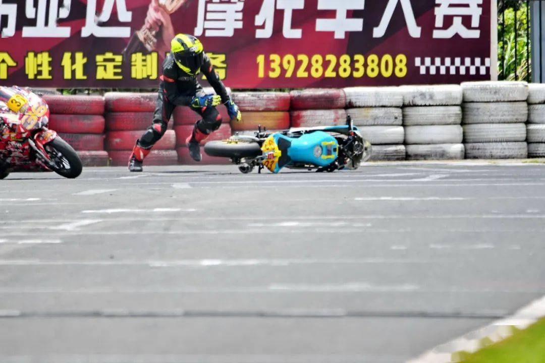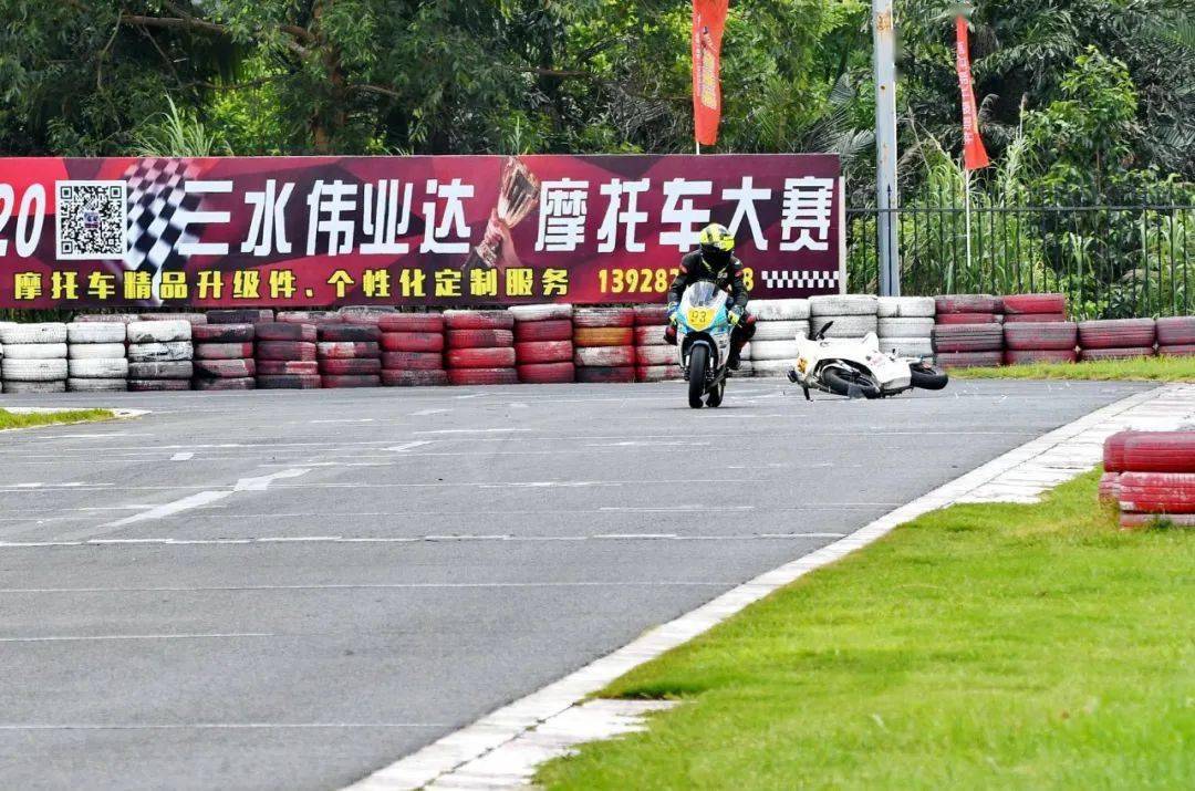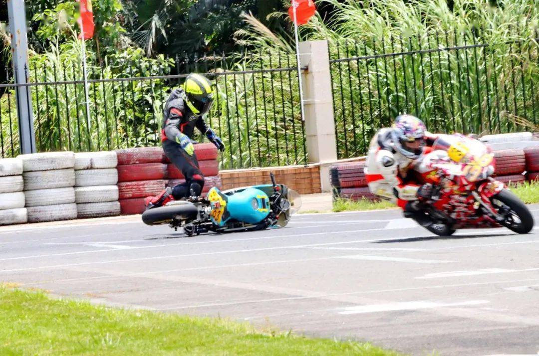 下面的圖片,MiniGP 150 組、決賽 1(第一節(jié)比賽),賽事的后段,先是駕駛 93 號(hào)車(chē)的關(guān)耀文,在進(jìn)入起跑線前的最后一個(gè)彎摔倒,但他仍能扶起賽車(chē)、并重返跑道。
