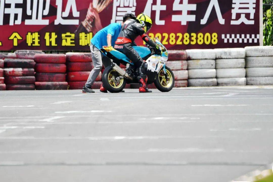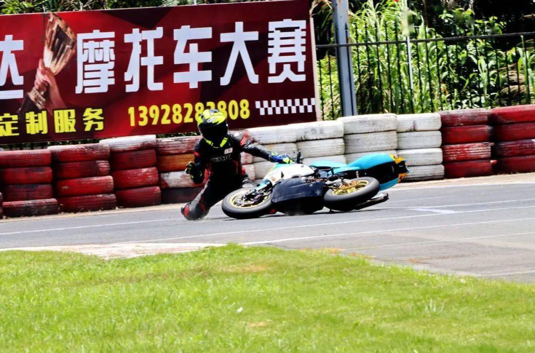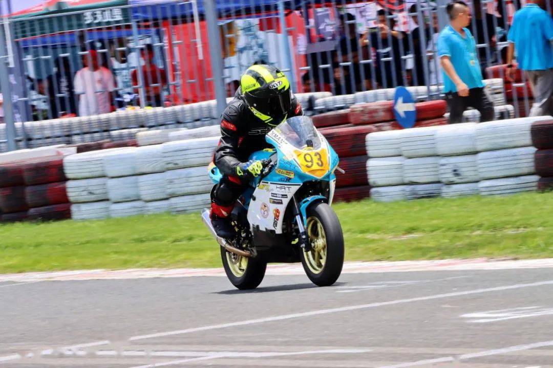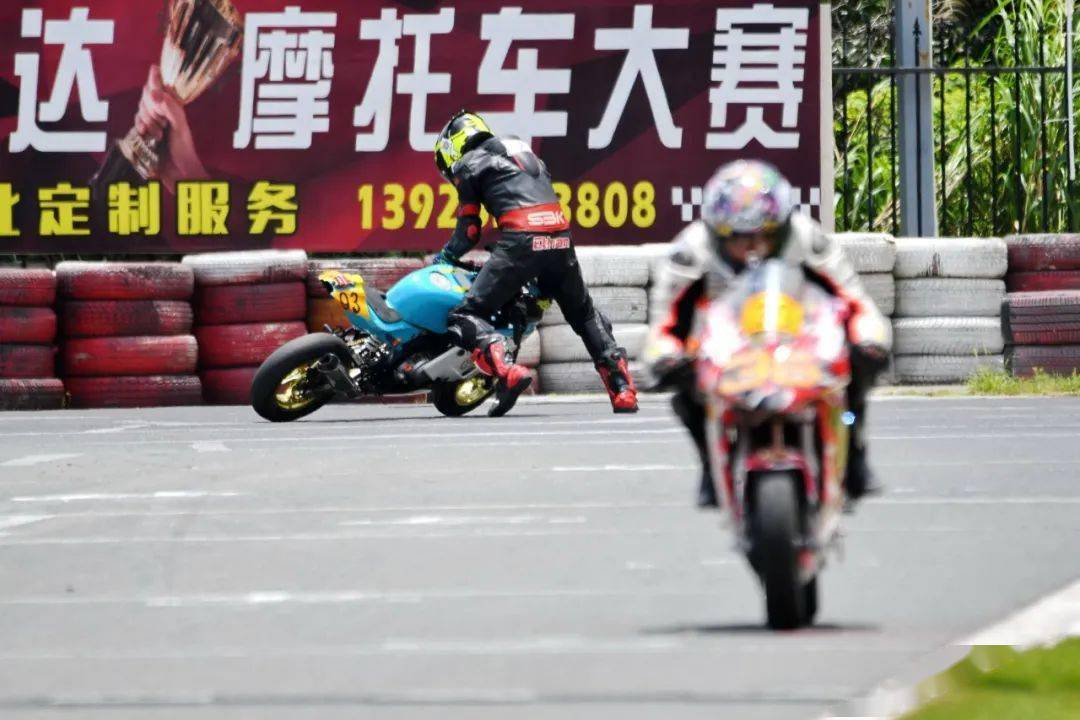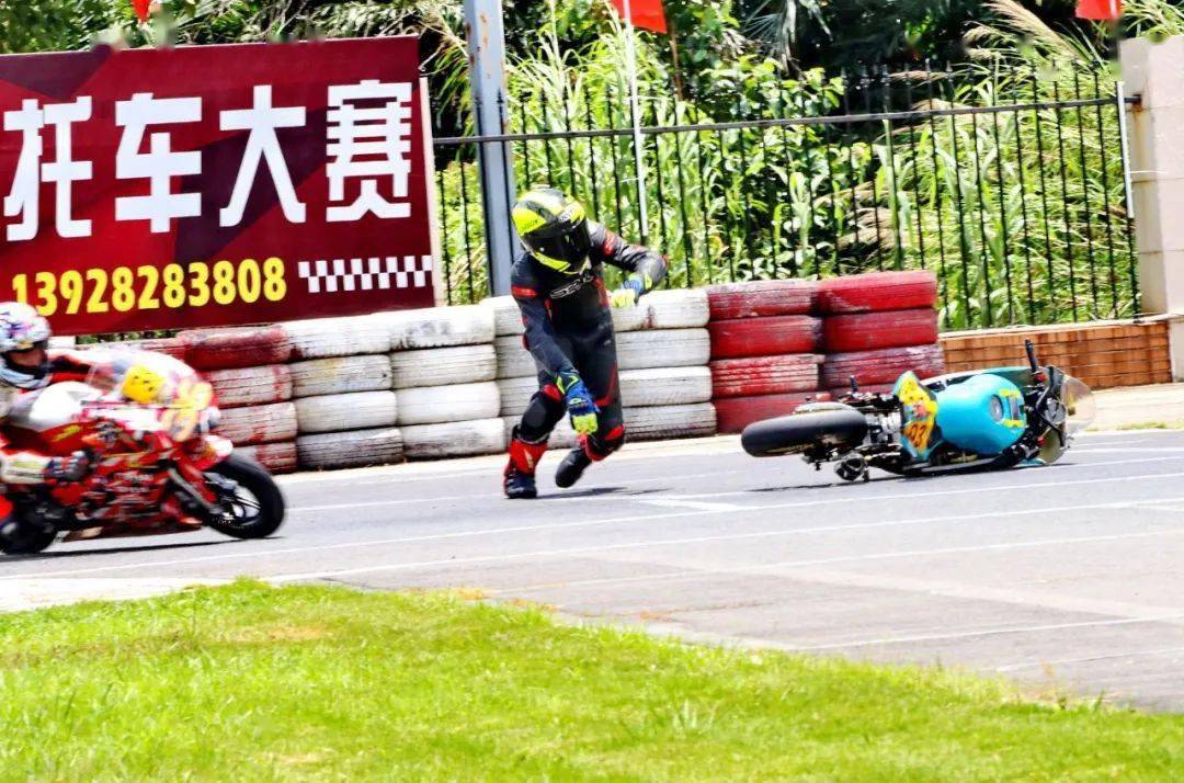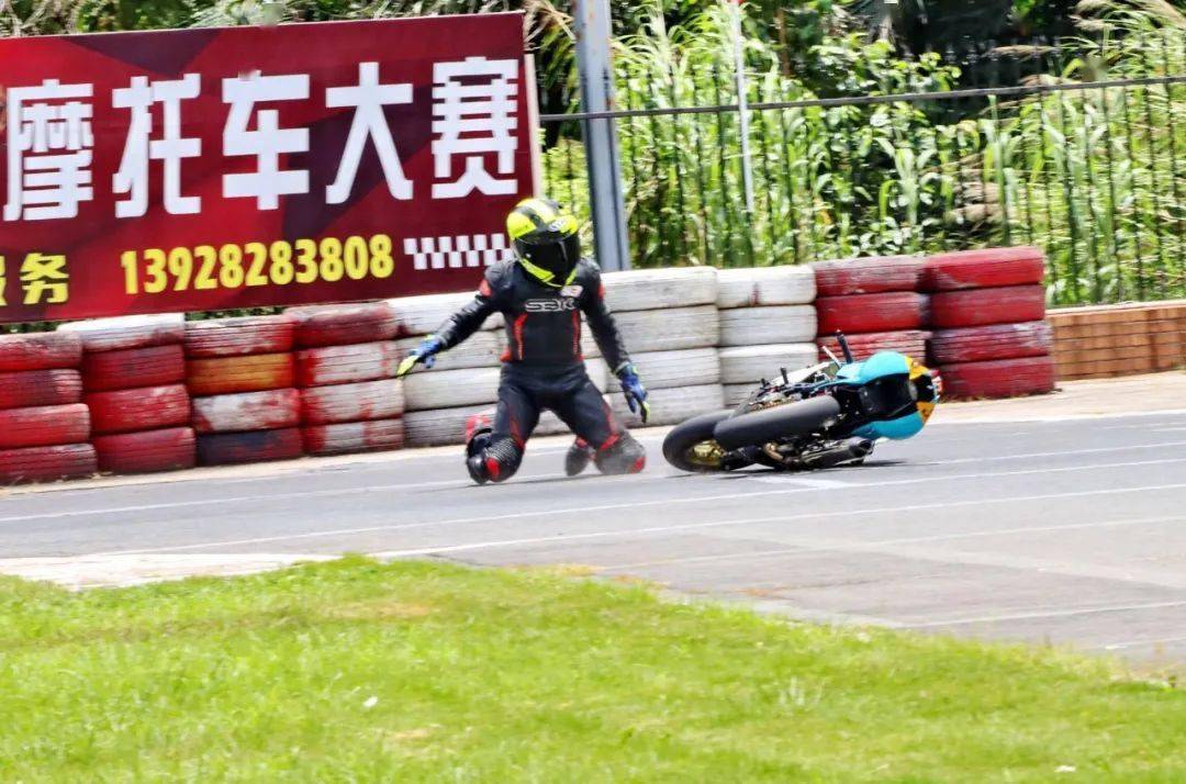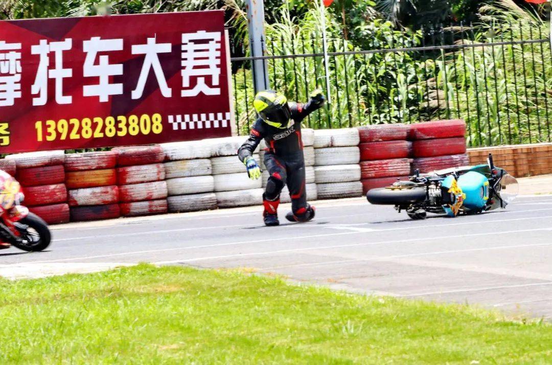下面的圖片,MiniGP 150 組、決賽 1(第一節(jié)比賽),賽事的后段,先是駕駛 93 號(hào)車(chē)的關(guān)耀文,在進(jìn)入起跑線前的最后一個(gè)彎摔倒,但他仍能扶起賽車(chē)、并重返跑道。