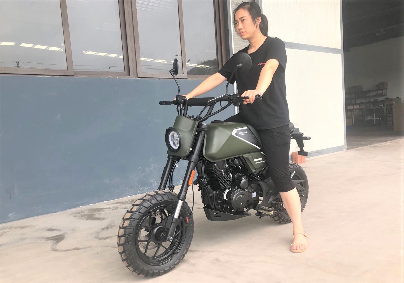 迷你摩托主要針對于嬌小身材的騎士,摩童D5的座高775mm,整備重量只有116kg,上圖當中158cm身高的女生雙腳可以完全著地,膝蓋微微彎曲略有余量,150cm左右身高的騎士都能輕松駕馭。