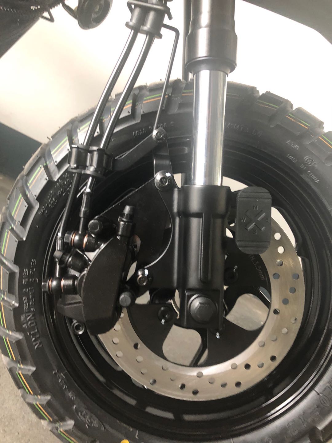 倒立式前叉是目前非常流行的配置,但是在迷你摩托車上,采用倒叉的車型并不多,最主要的原因還是因為其成本比傳統(tǒng)正叉高的多。摩童D5的前叉由渝安提供,避震行程較長在非鋪裝路面的行駛表現(xiàn)出色;剎車規(guī)格為單盤+雙活塞剎車卡鉗的形式,完全夠用。