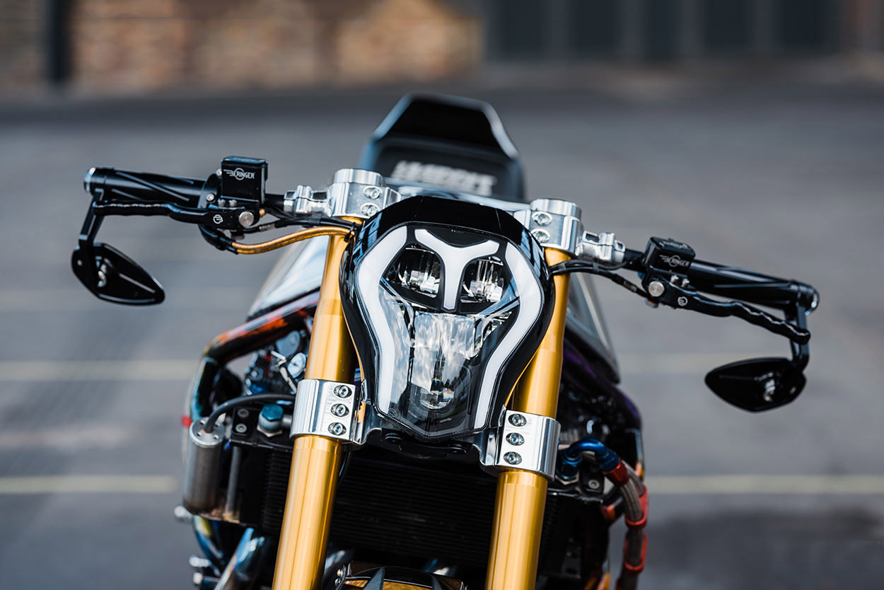 在更高的位置,制作了玻璃纖維尾翼單元以補充,前排是定制的擋泥板,位于改良的Benelli大燈下方。在它的后面,沃爾夫岡(Wolfgang)將微型數碼Motogadget speedo與一系列LED指示燈一起沉入了頂叉。駕駛艙的其余部分配備了,沃爾夫岡本人制造的鋁制把手,Motogadget迷你開關和桿端轉向信號燈以及一組桿端后視鏡。后轉向信號來自凱勒曼,并且兼作尾燈。