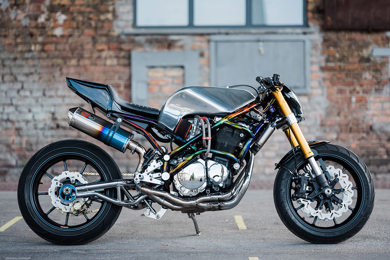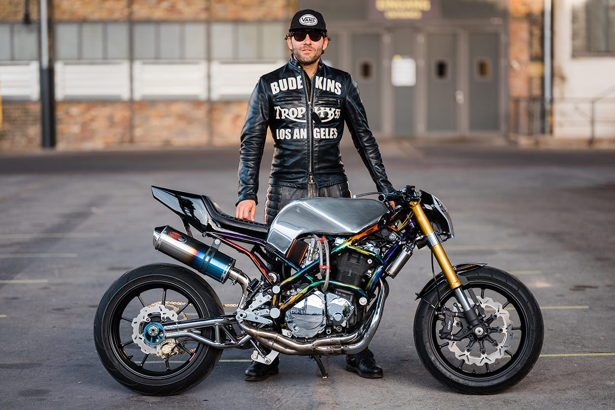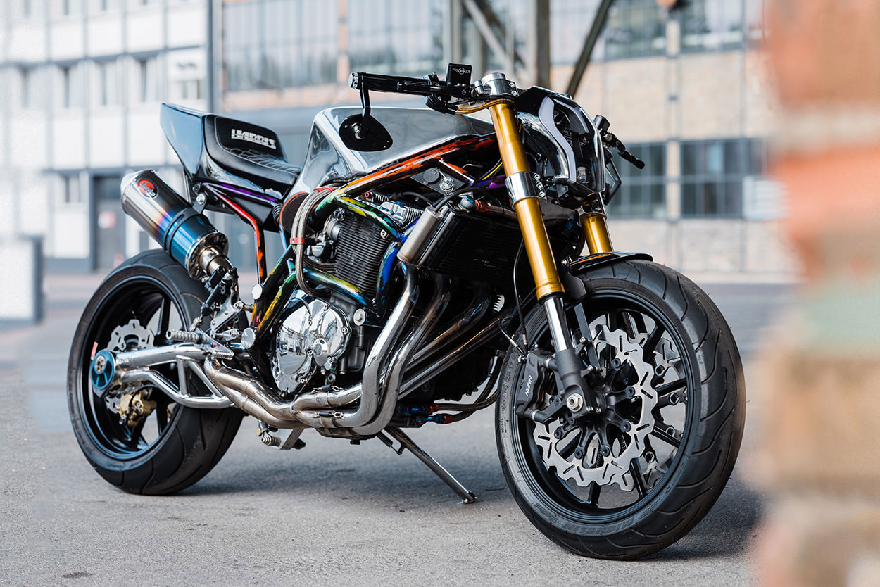 哈里斯·馬格南姆 4號(Harris Magnum 4)是90年代著名的摩托車,具有特殊的管狀鋼制框架,而今天文中這臺車是1995年制造的,被稱為“ Bullenbeisser”和最初是由一個叫“喬治”的人建造的。“ Bullenbeisser”是這個怪物的專有名稱。Magnum 4底盤最初經過重新設計,以使用Suzuki GSX-R1100前懸架。