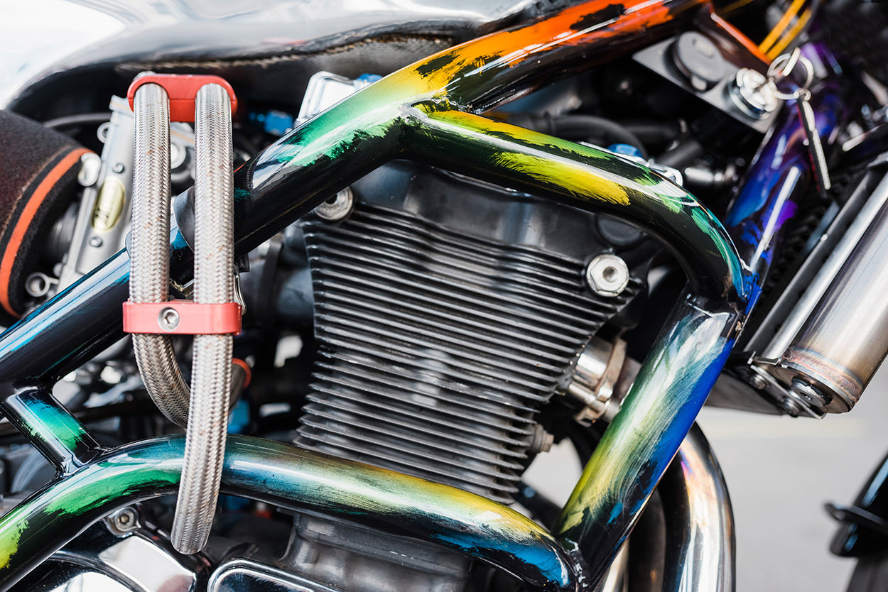 大多數組件都具有鍍鉻,拋光,原始或黑色的飾面,除了彩色彩色鏡框之外,最終所呈現的是90年代街頭霸王應有的特色,具有頂級組件,咖啡賽車風格的襯托之下相當完美這些艷麗的顏色用指甲油繪制,然后用一層光滑的油漆封存。