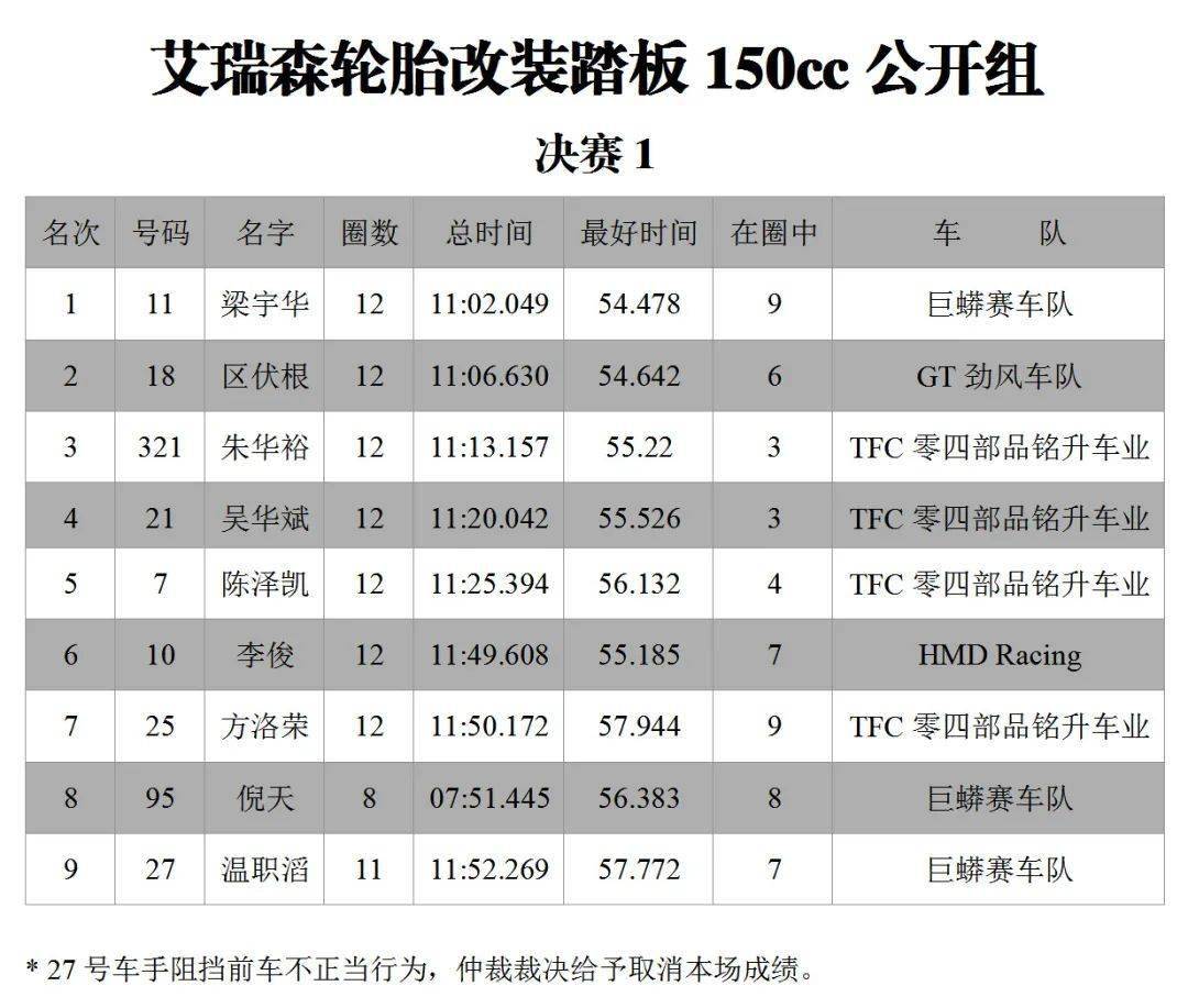 出于對(duì)安全的考慮,賽會(huì)隨后取消了六個(gè)組別(踏板新人組、艾瑞森輪胎改裝踏板 150 cc 公開組、鐵人 TR-1 統(tǒng)一組、小童組、MiniGP 150 組、田達(dá) TDR 統(tǒng)一組)的第二節(jié)比賽。最終,這六個(gè)組別,以決賽 1 的成績(jī)、作為計(jì)算第二回合總成績(jī)的依據(jù)。