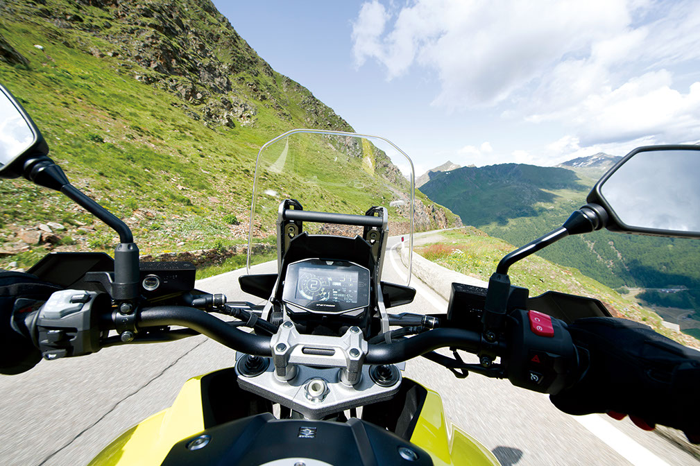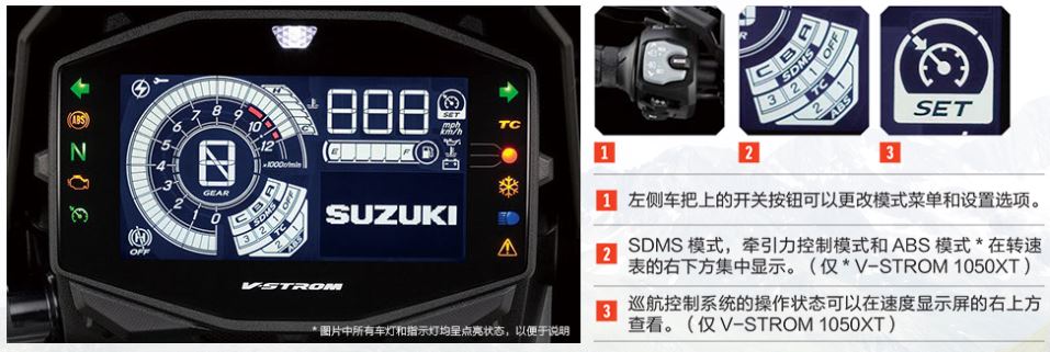 V-Strom 1050/XT儀表板采用家族式的布局,整個(gè)LCD屏幕上顯示豐富的數(shù)據(jù),內(nèi)容包括速度表、轉(zhuǎn)速表(全像素?cái)?shù)字顯示)、檔位指示燈、里程表、行程表 (A、B)、瞬時(shí)油耗、平均油耗、可繼續(xù)行駛里程、油位指示燈、發(fā)動(dòng)機(jī)冷卻液溫度指示燈、環(huán)境溫度指示燈、時(shí)鐘、電壓表、服務(wù)提示、SDMS 模式、牽引力控制模式、巡航控制指示燈、ABS 模式、坡道保持指示燈、發(fā)動(dòng)機(jī)轉(zhuǎn)速指示燈、凍結(jié)指示燈、轉(zhuǎn)向指示燈、遠(yuǎn)光燈、牽引 力控制指示燈、ABS 指示燈和空檔指示燈。