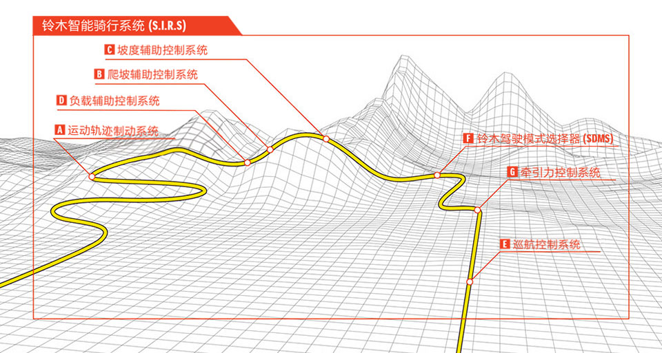 鈴木智能騎行系統(tǒng) (S.I.R.S) 包括運(yùn)動(dòng)軌跡的輔助制動(dòng)系統(tǒng)、爬坡及坡道輔助控制系統(tǒng)和與負(fù)載相關(guān)的輔助控制系統(tǒng),以及巡航控制系統(tǒng)、鈴木駕駛模式選擇器 (SDMS) 和牽引力輔助控制系統(tǒng)。