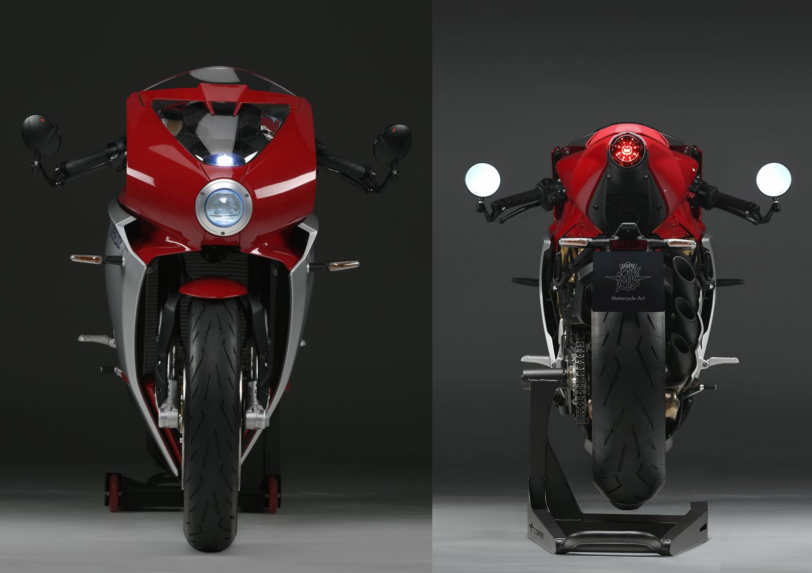 制動(dòng)方面由Brembo提供,在前輪上使用四活塞卡鉗,和直徑320毫米的制動(dòng)盤,在后部使用220毫米制動(dòng)盤的兩活塞卡鉗。具有競(jìng)速模式的Bosch ABS 9 Plus系統(tǒng)是標(biāo)準(zhǔn)裝備,并具有RLM(后輪舉升緩解)功能,可防止Superveloce 800在強(qiáng)力制動(dòng)時(shí)抱死。