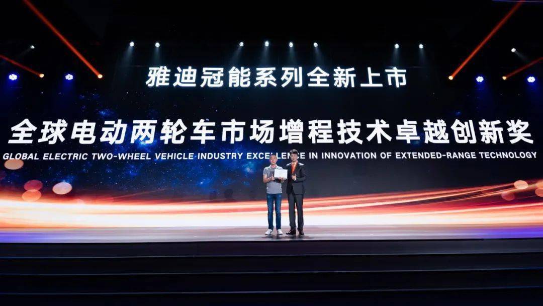 在發(fā)布會(huì)上,國(guó)際權(quán)威調(diào)研機(jī)構(gòu)弗若斯特沙利文咨詢(xún)公司給雅迪頒發(fā)了“全球電動(dòng)兩輪車(chē)市場(chǎng)增程技術(shù)卓越創(chuàng)新獎(jiǎng)”。