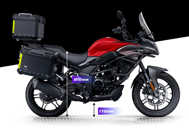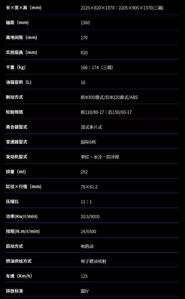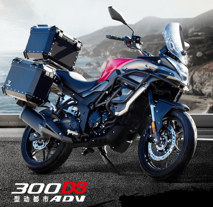 底盤方面采用鋼管式車架加倒立式前叉及預(yù)載可調(diào)中置后減震的組合,輪胎規(guī)格前110/80-17,后輪150/60-17。前制動(dòng)單向雙活塞卡鉗配300mm制動(dòng)盤,后制動(dòng)單活塞卡鉗配220mm制動(dòng)盤,同樣搭載賽福的ABS系統(tǒng)。座高810mm,最小離地間隙170mm。其他方面300DS采用全車LED光源,16L的油箱容積,更大尺寸的負(fù)顯液晶儀表,干重166kg,濕重狀態(tài)大概在180kg左右。