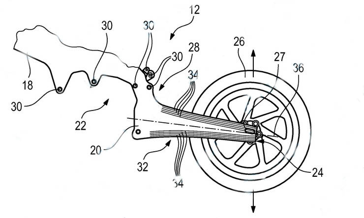 寶馬最新專利通過將后搖臂集成到主車架中,而擺脫了對后搖臂樞軸的需求,從而展示了一種全新的設(shè)計。碳纖維可以設(shè)計成單方向剛性的,而在另一個方向上是柔性的,從而使后搖臂彎曲以吸收顛簸,但橫向保持剛性。但是仍將使用常規(guī)的彈簧和減震器,從而可以調(diào)節(jié)懸架,但是碳會提供一定比例的彈簧效果。